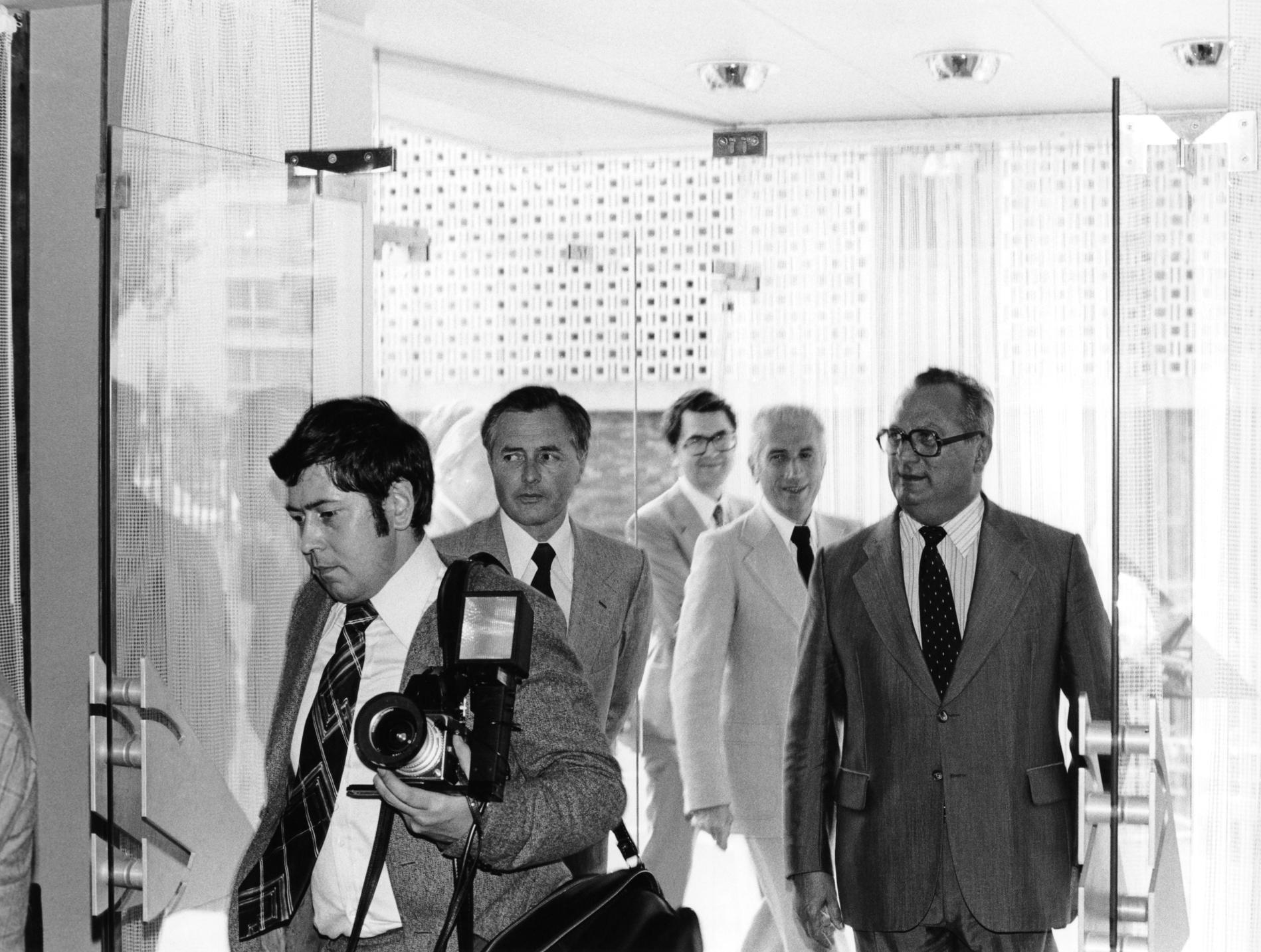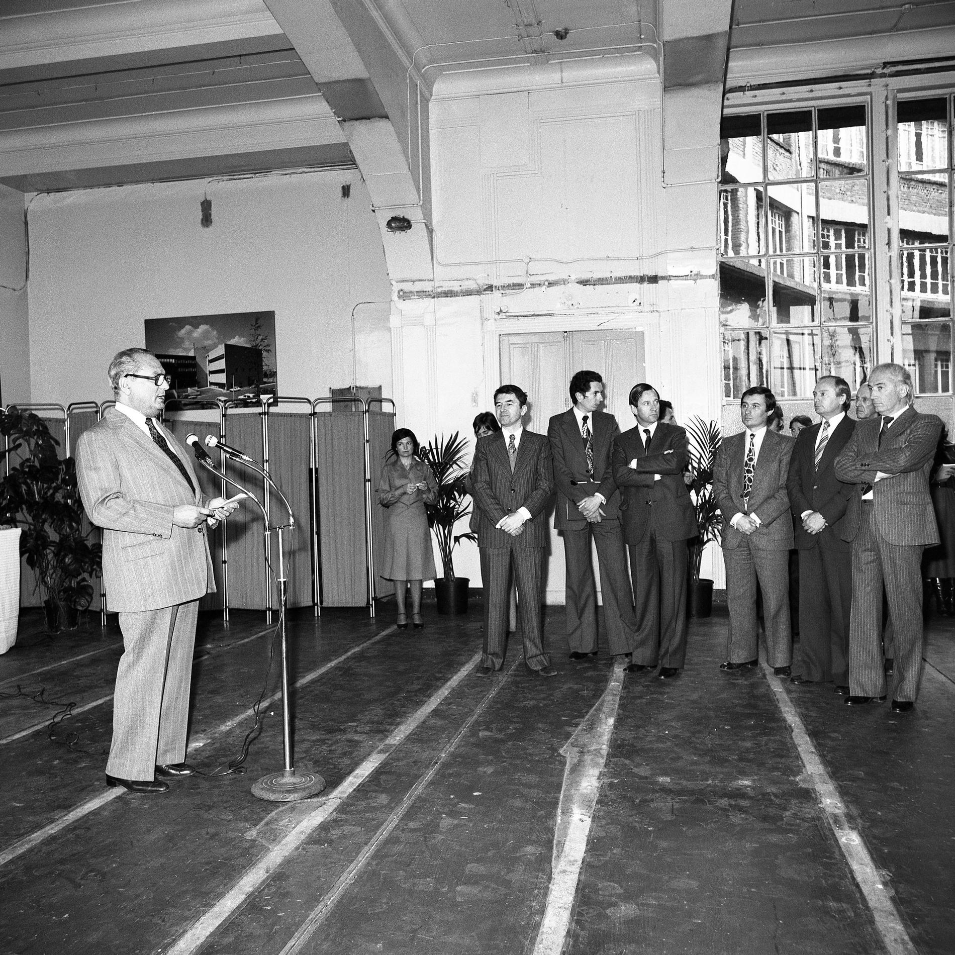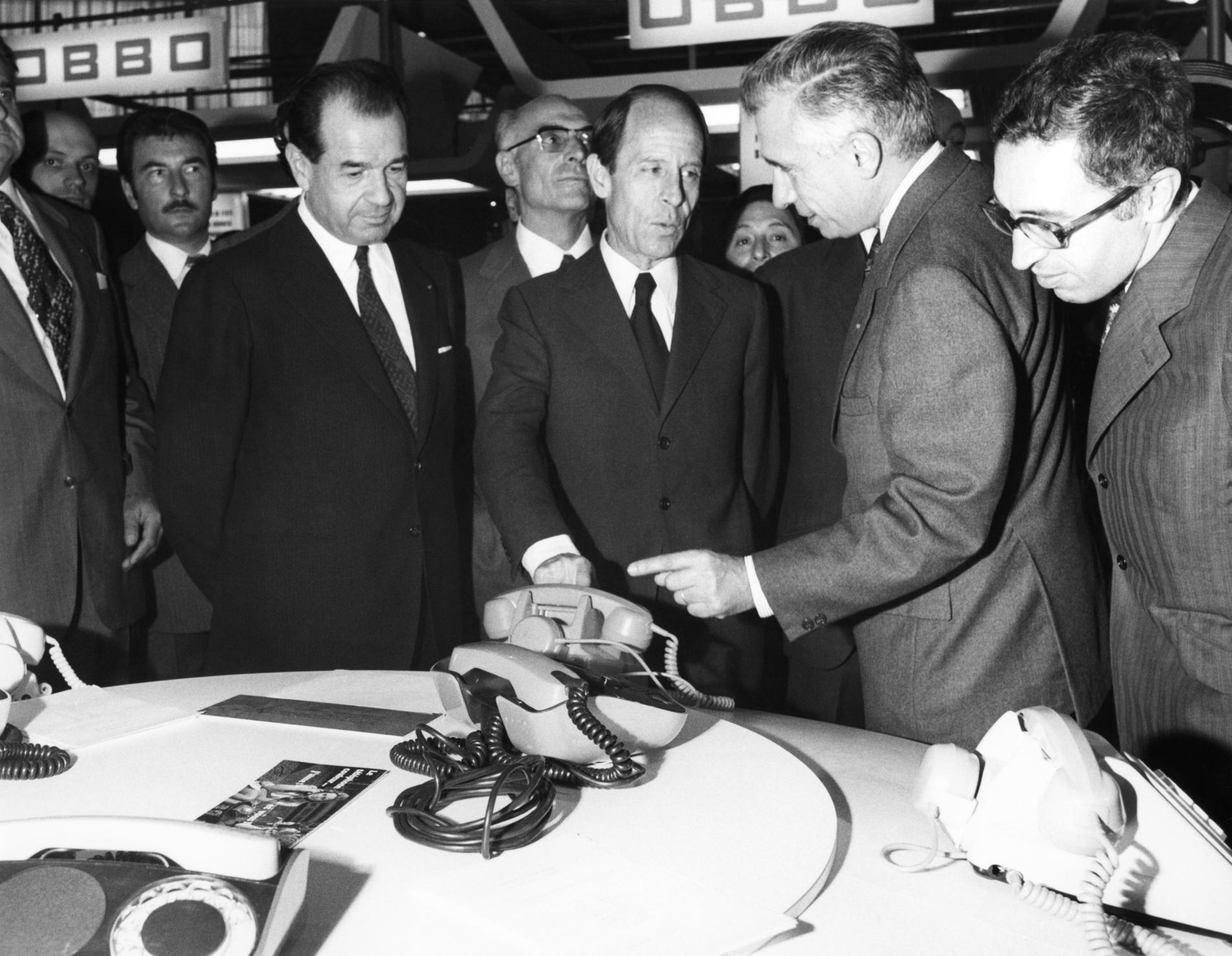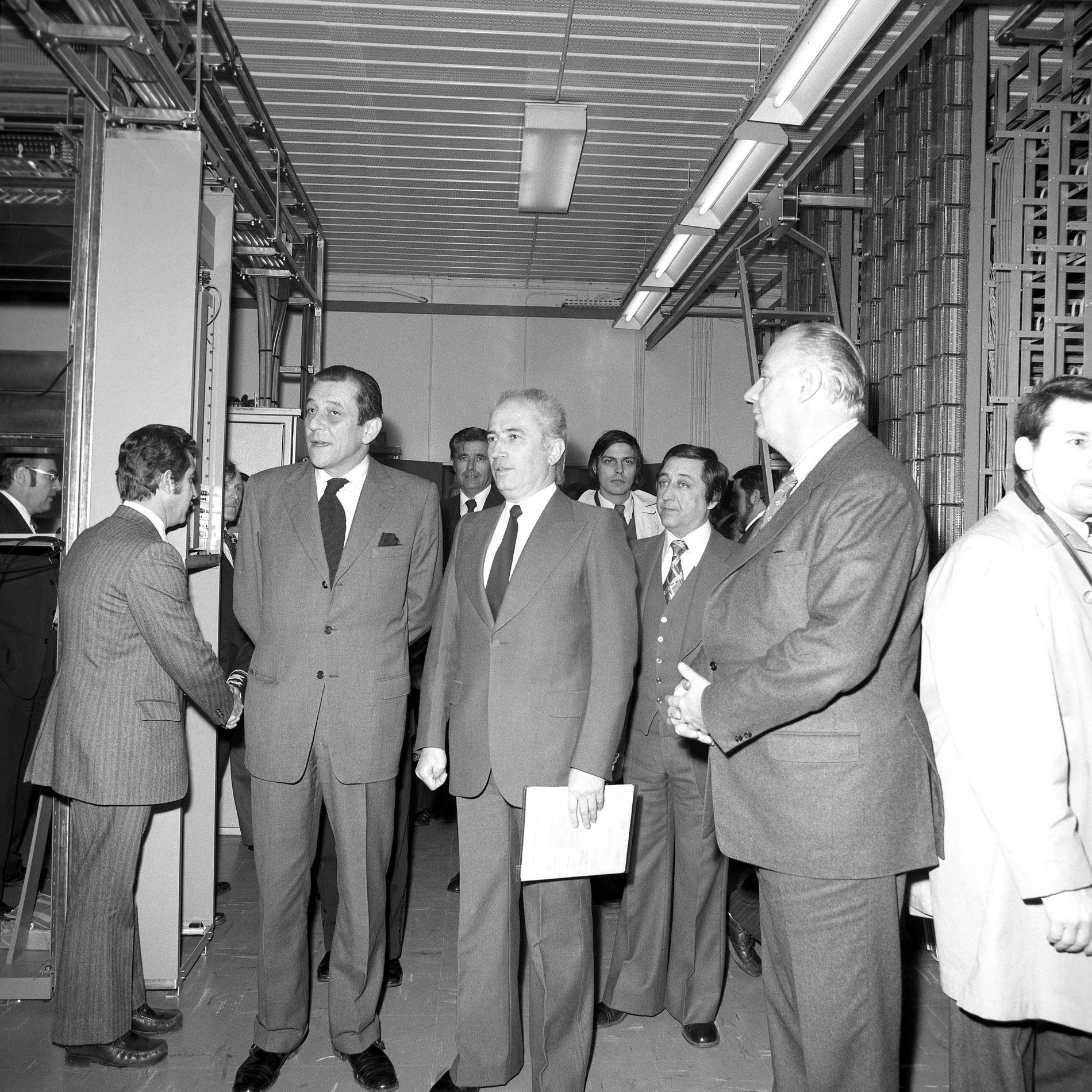 Une délégation de M. le Ministre français des PTT reçue à l'usine L. M. Ericsson de Midsommarkransen (Suède), pour une visite d'une heure dans les laboratoires et les ateliers.