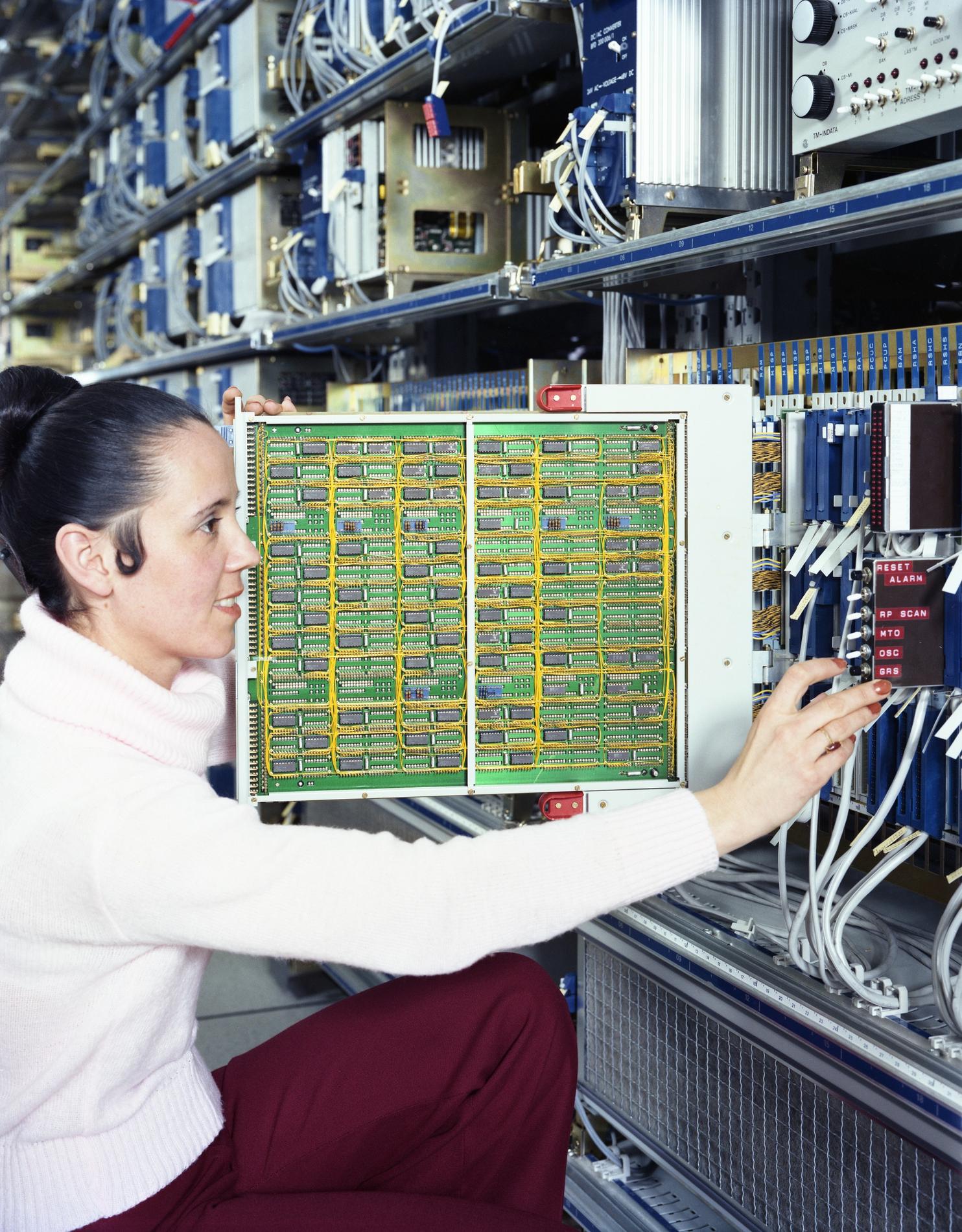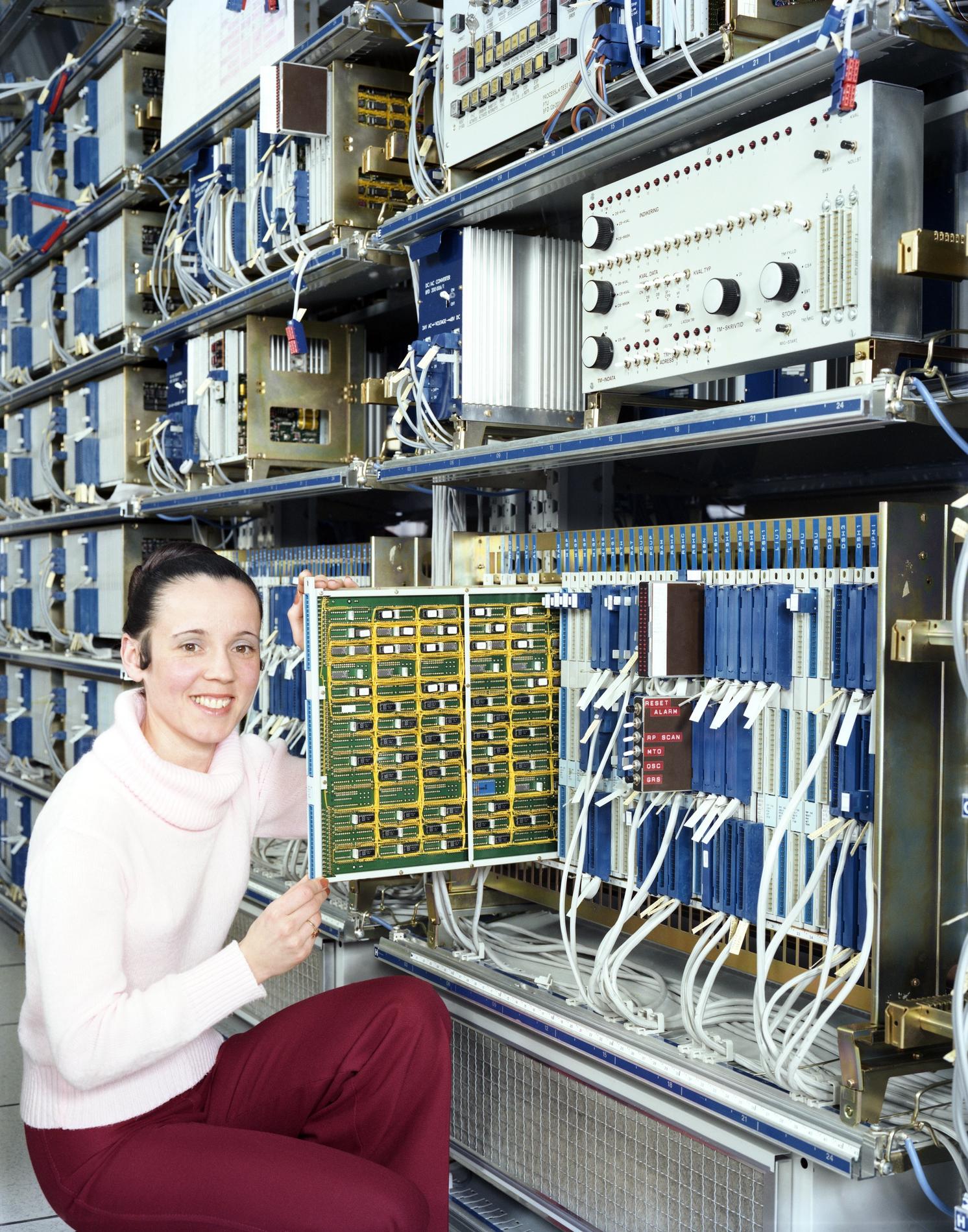 Ci-dessus : Technicienne montrant des cartes d'un des Calculateurs du Commutateur AXE Spatial Orléans Grenier-à-Sel (OR10).