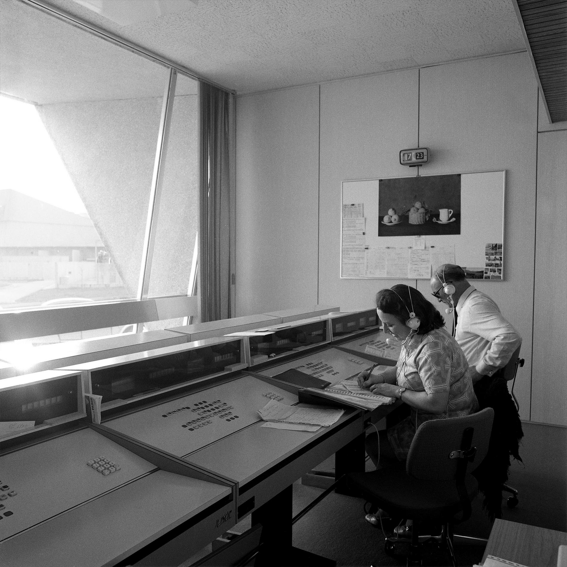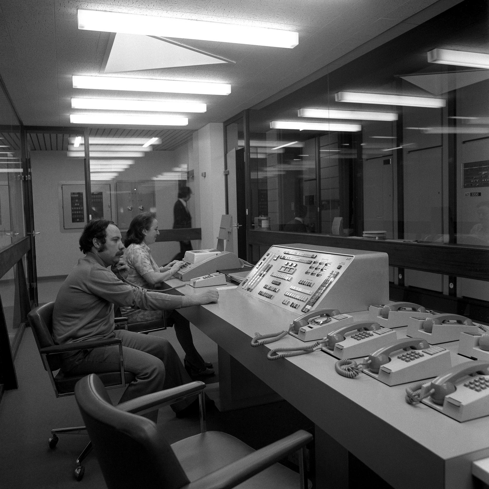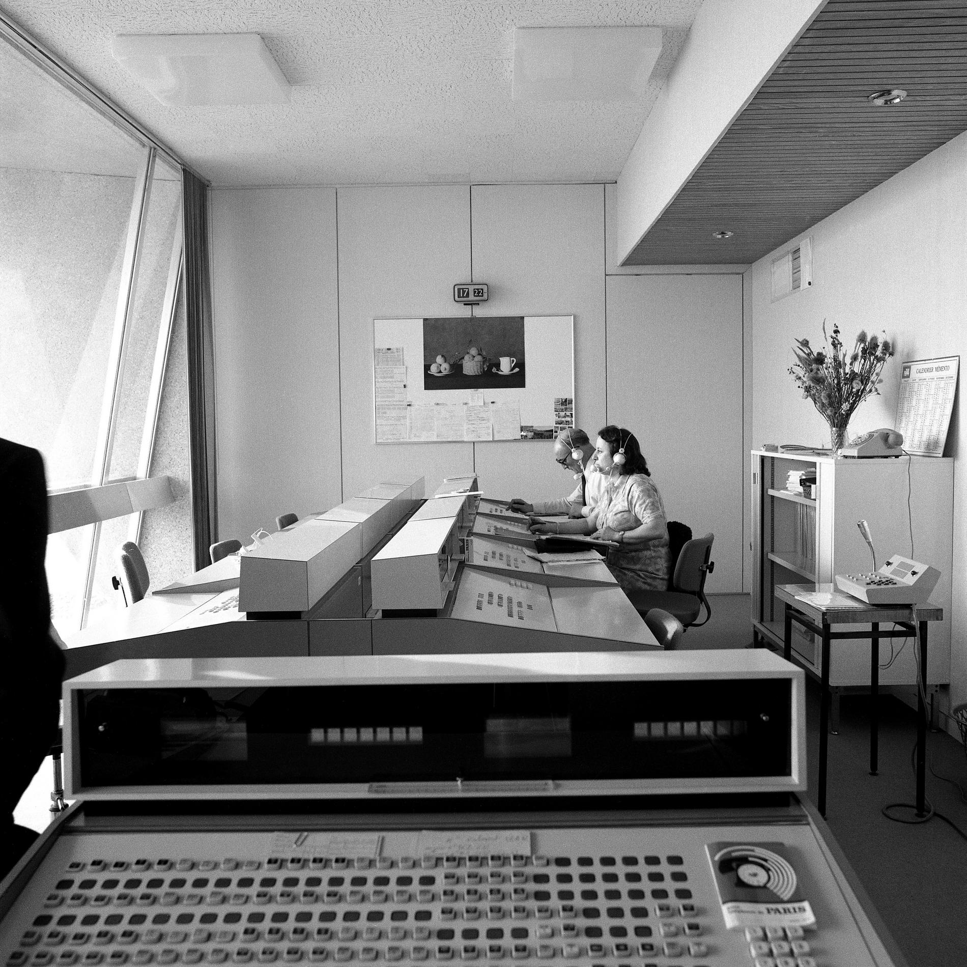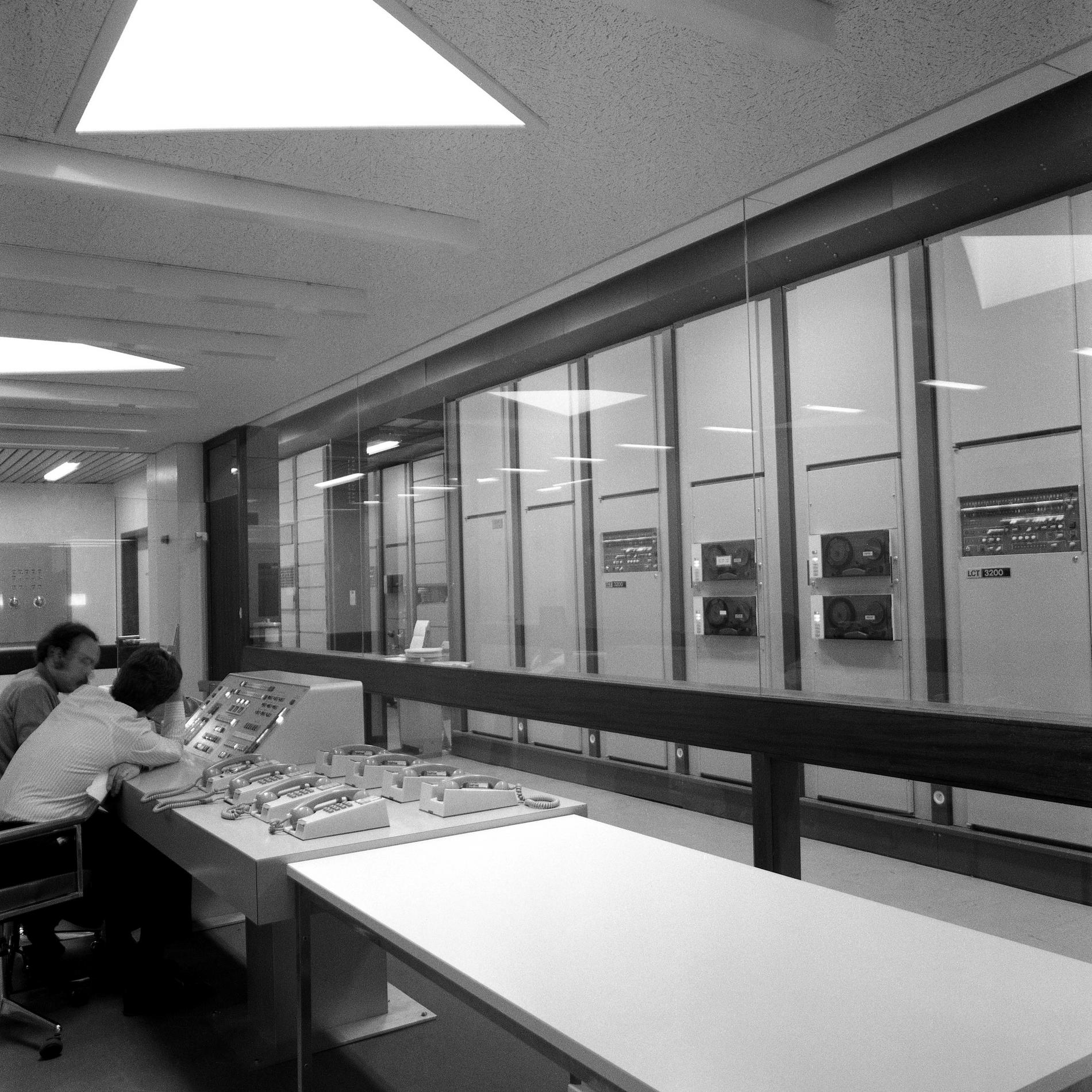 Ci-dessus : vue à partir de la salle de supervision du Commutateur AXE Spatial Soisy-sous-Montmorency B1 (NE32) alors en construction.