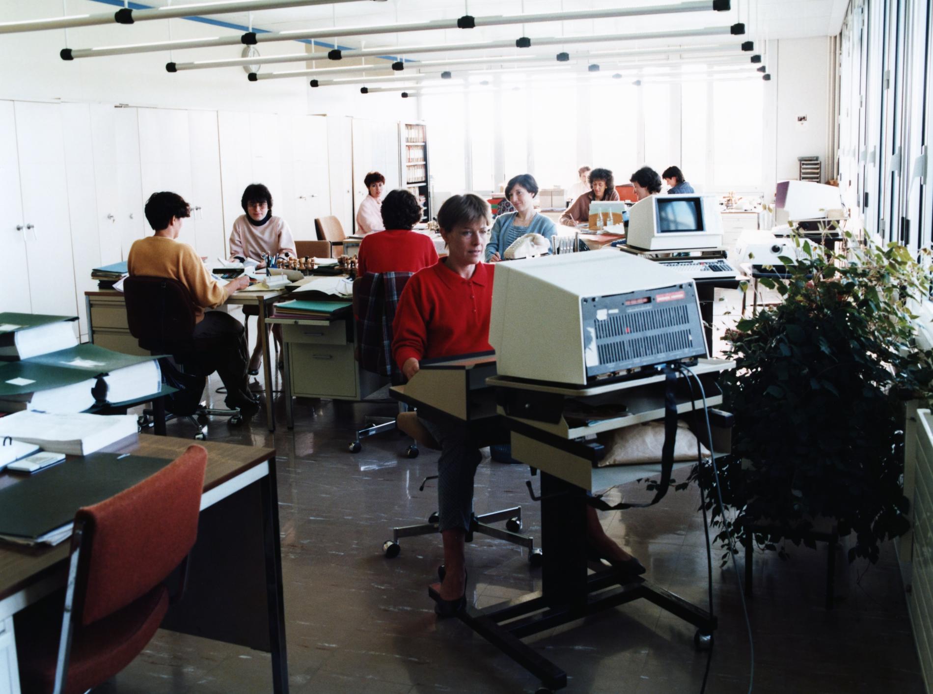 Ci-dessus : agent en cours de consultation devant son terminal, des relevés de taxation de lignes téléphoniques de son Centre Principal d'Exploitation, à Fontainebleau.
