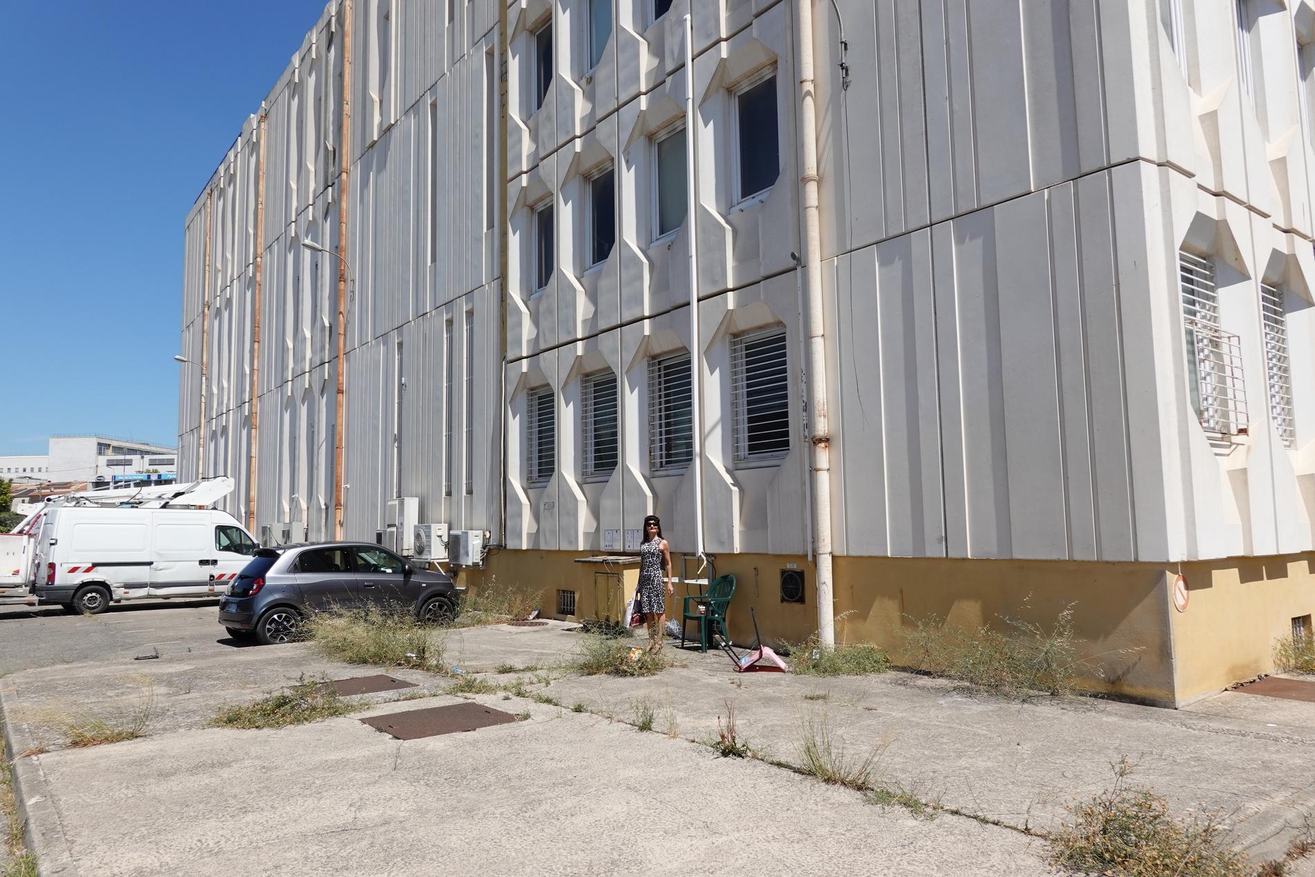Aspect caractéristique d'un centre téléphonique des années 60-70, réalisé en panneaux de béton armé préfabriqués, architecture industrielle utilitaire pompidolienne voire soviétiforme de l'époque. Photographie C. R-V.