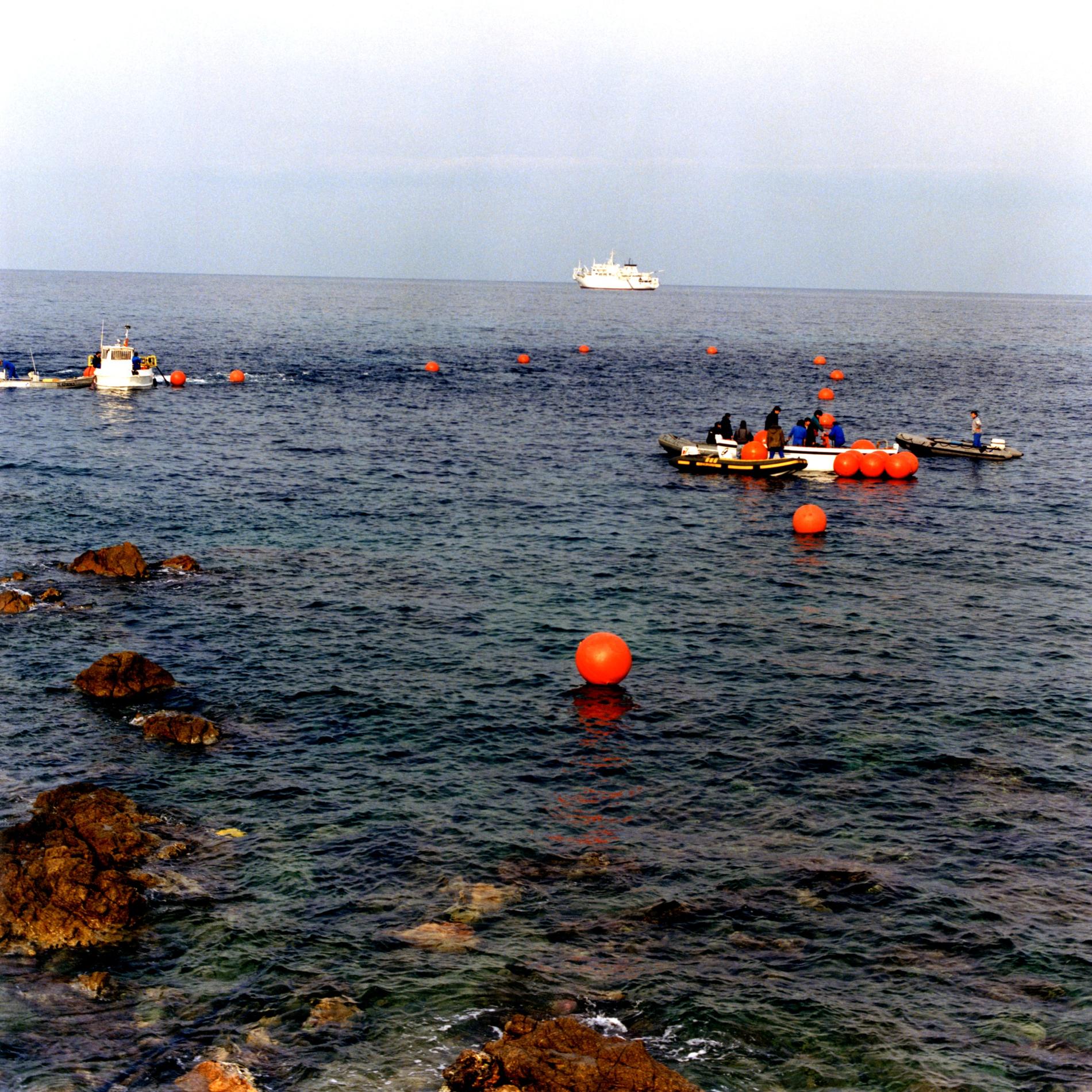 Ci-dessus : navire câblier Raymond Croze et ses équipes, à proximité de L'Île-Rousse (Isula Rossa) pendant la pose du câble sous-marin de télécommunications à fibre optique entre Cannes et L'Île-Rousse (câble CC4) -