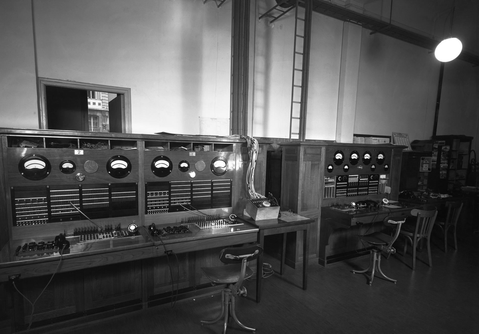 Ci-dessus : inauguration de la première liaison téléphonique Interurbaine à très-grande distance Paris - Lyon (500 km), dans les locaux du Commutateur Interurbain 2FR.