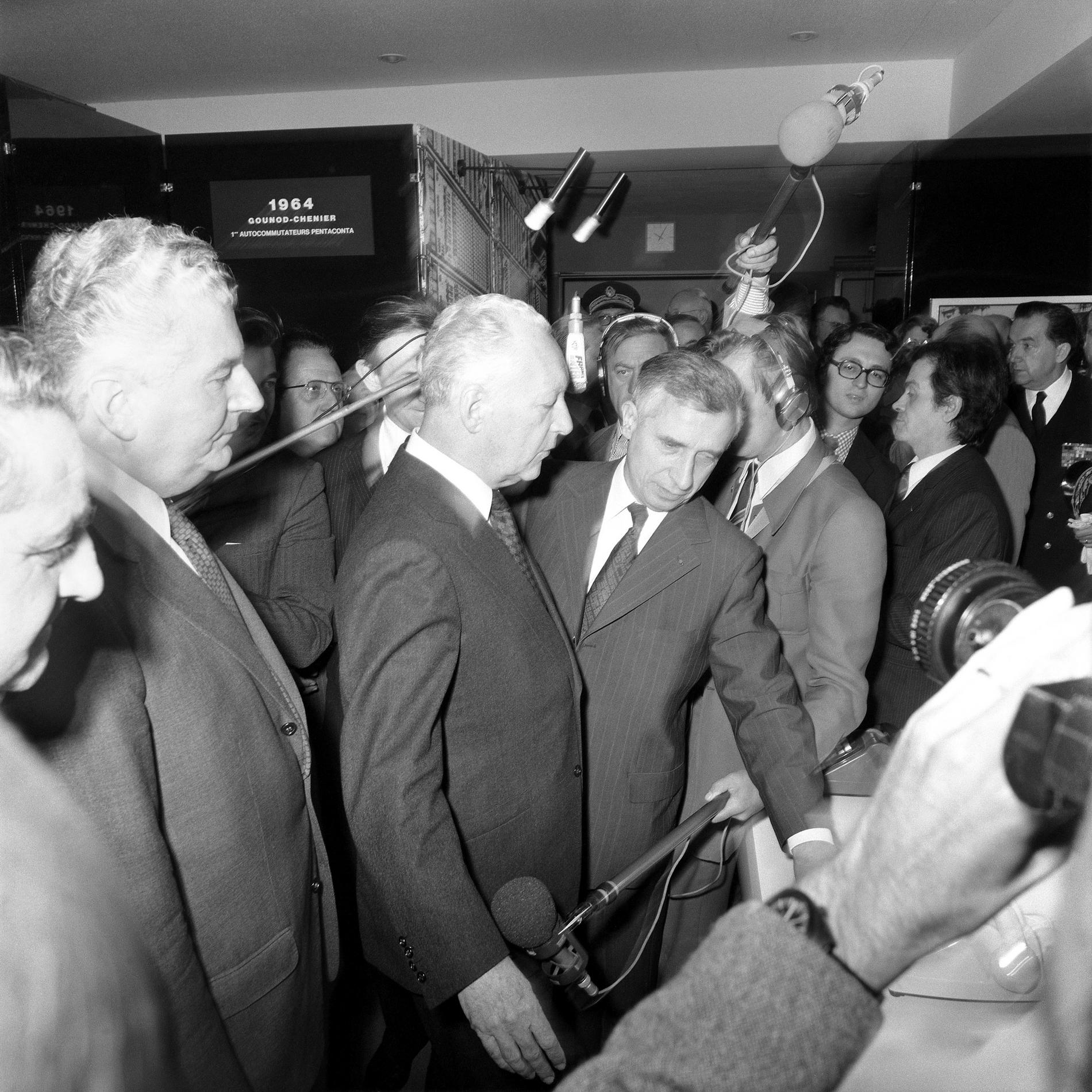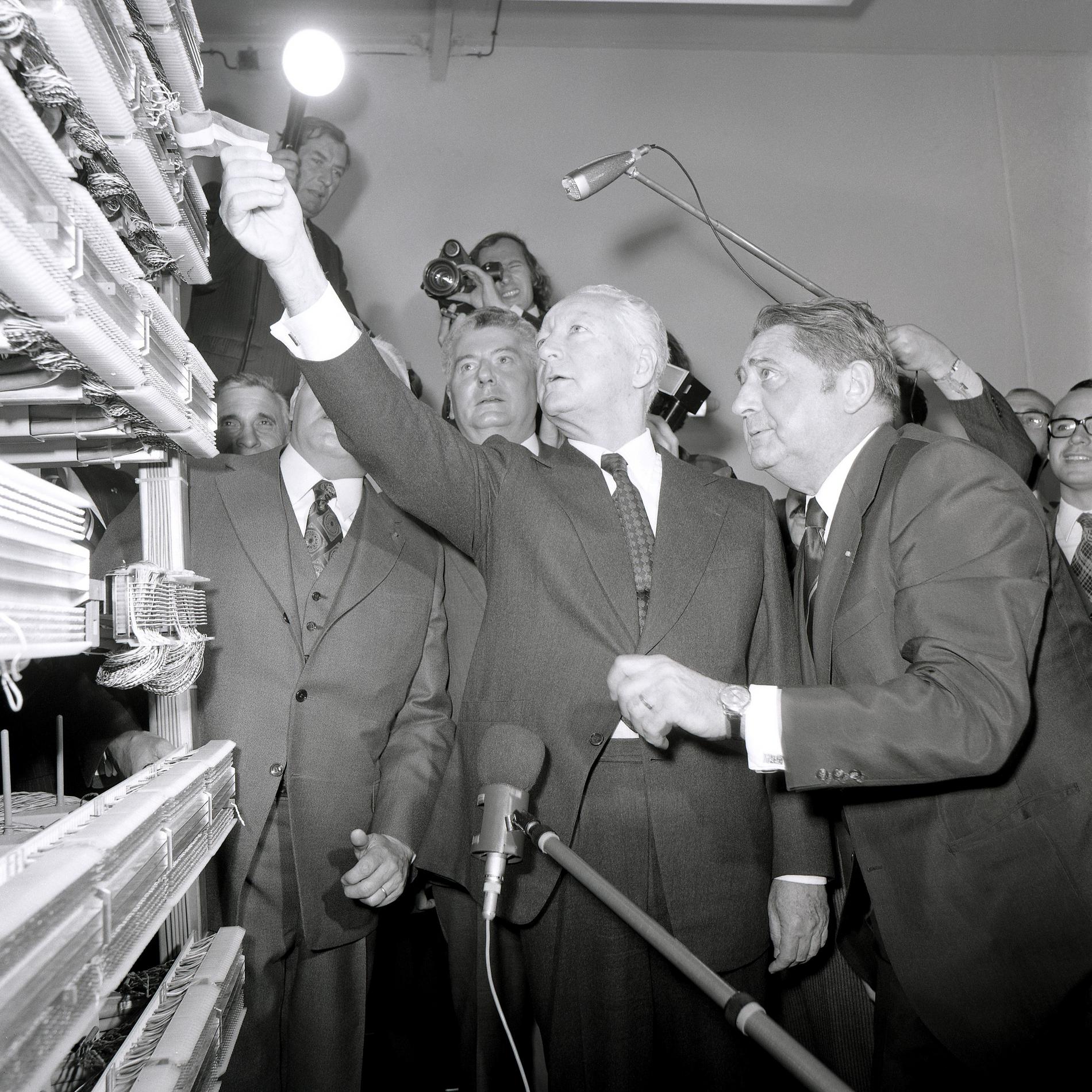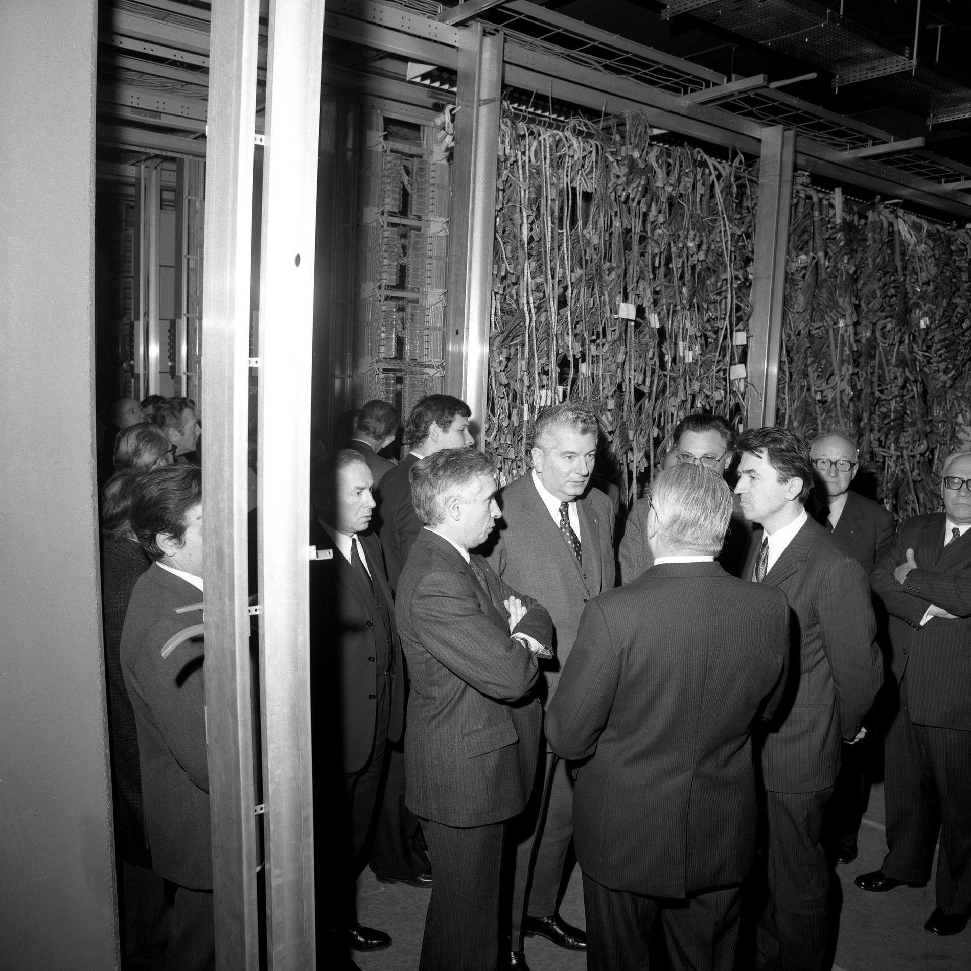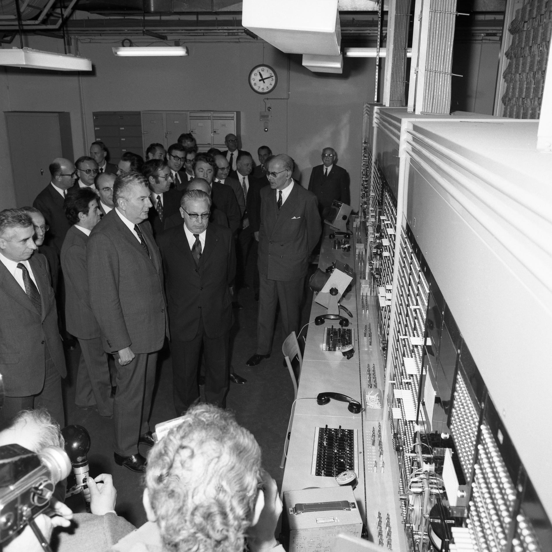 Ci-dessus : inauguration solennelle du Centre Téléphonique Tuileries par M. le Premier Ministre - Pierre Messmer, entouré de hautes personnalités.