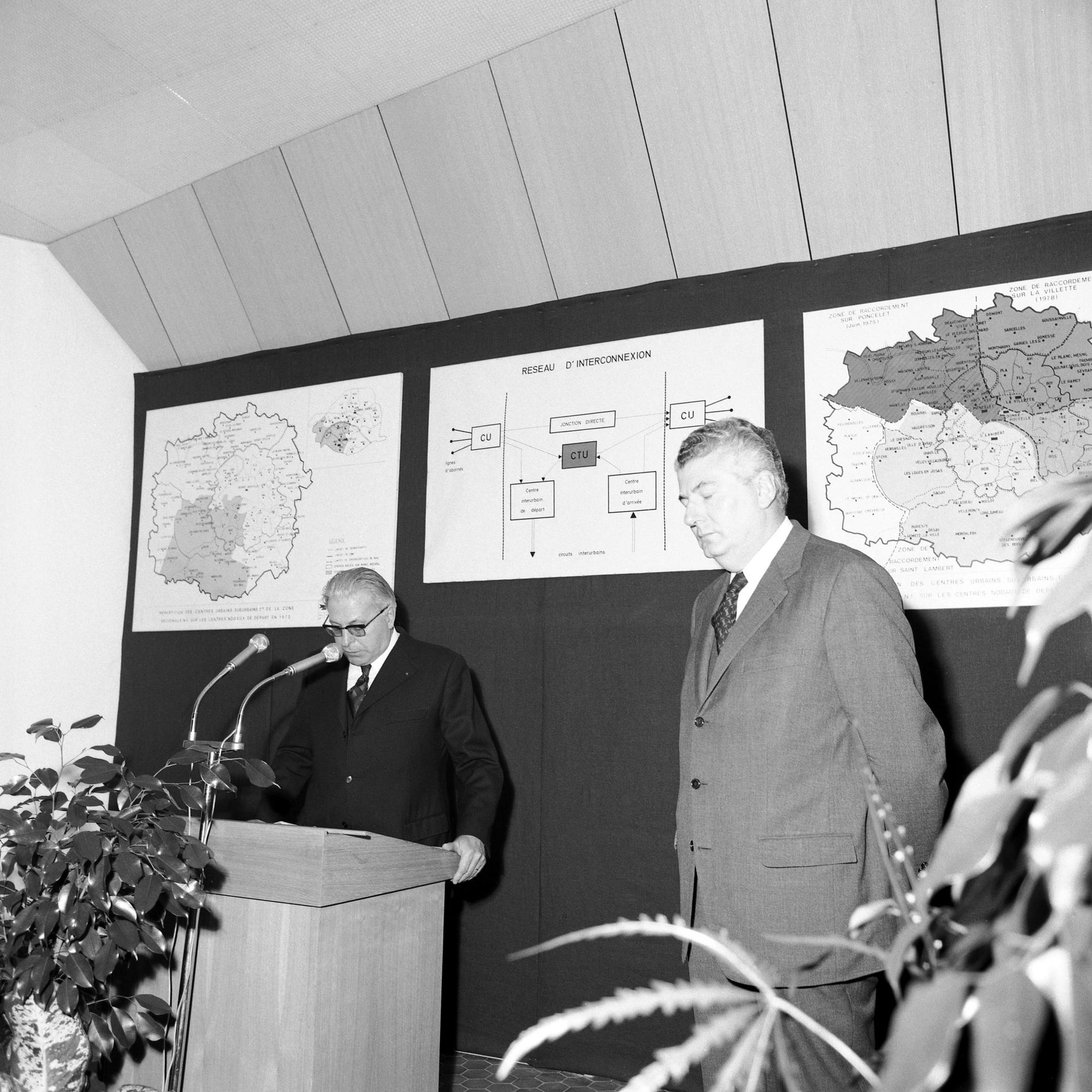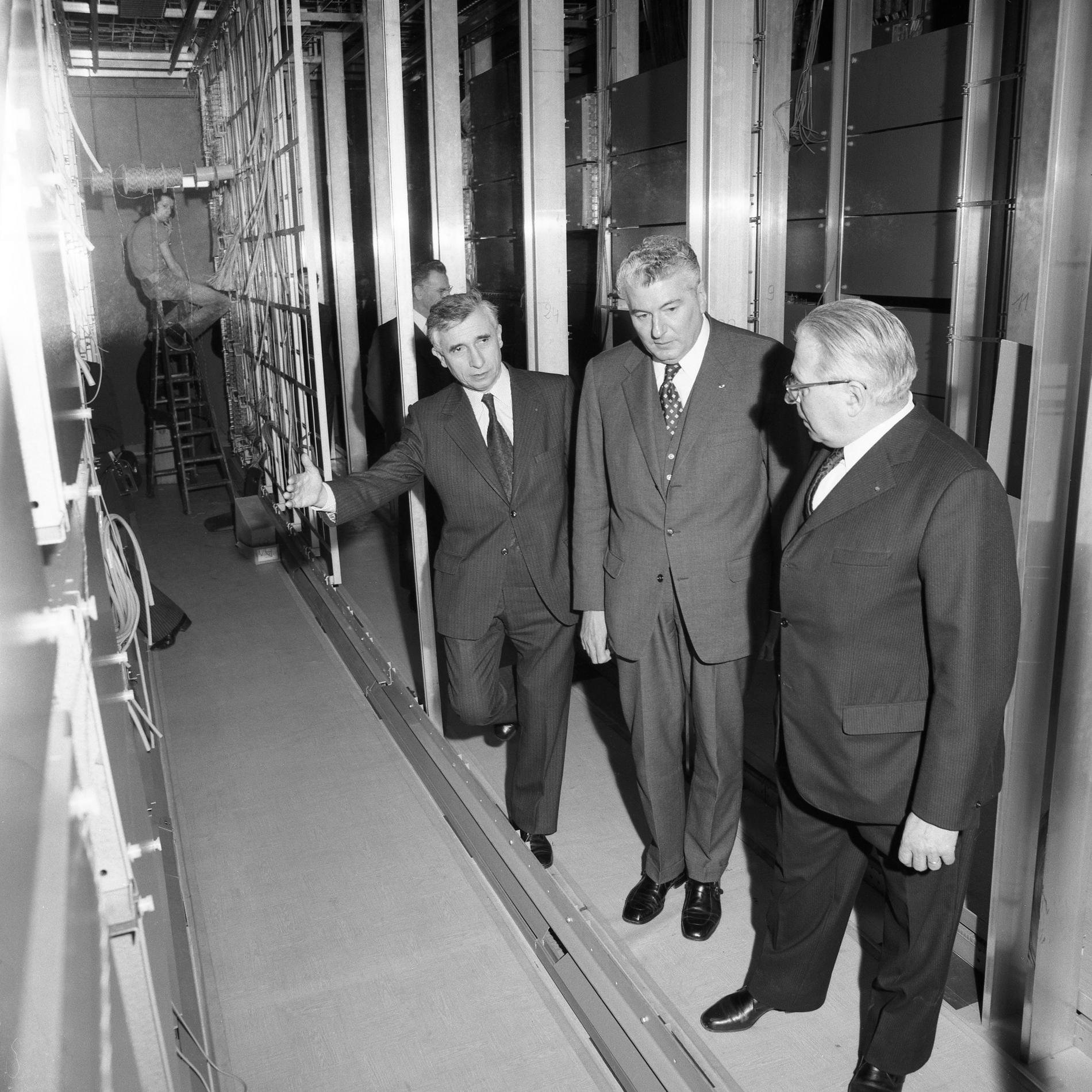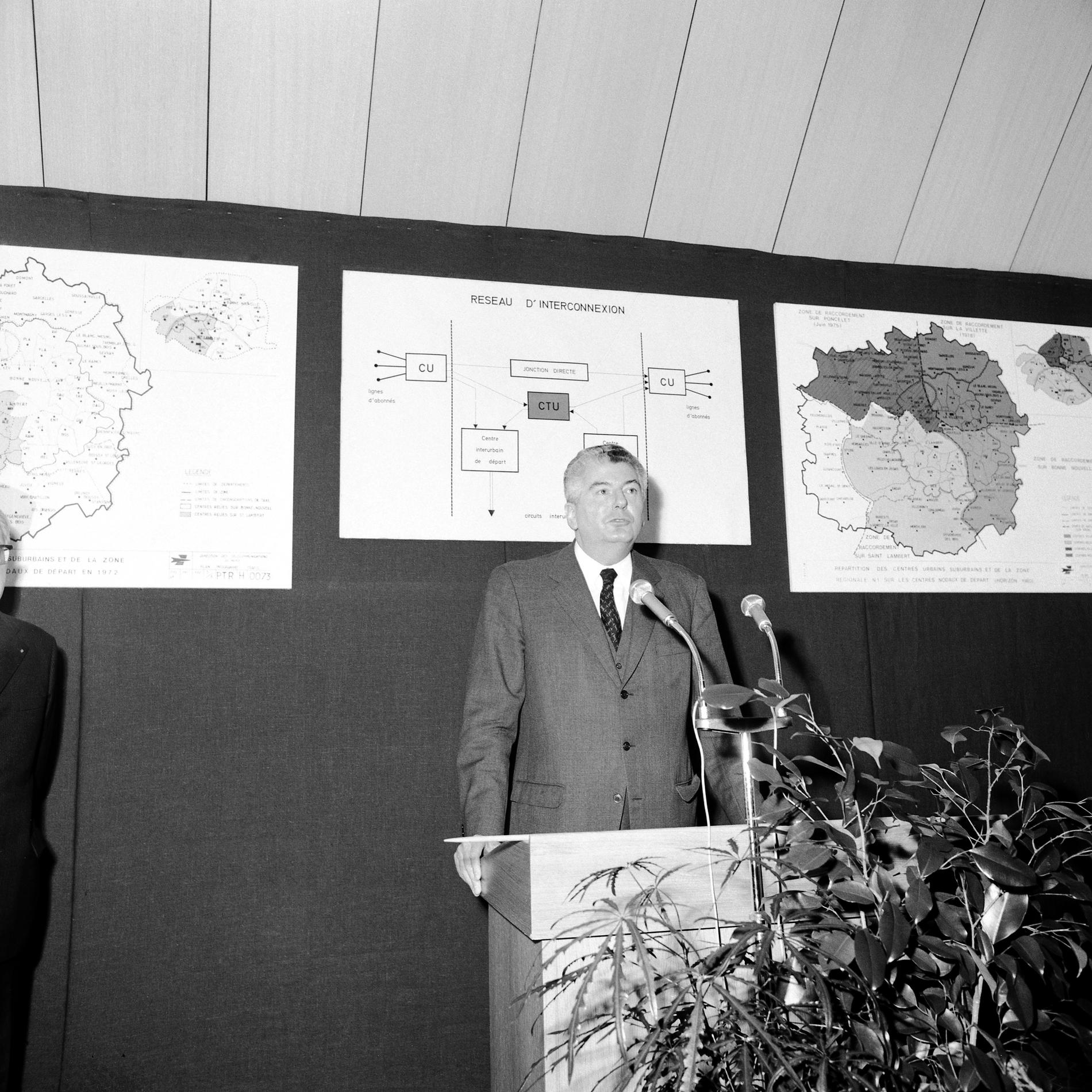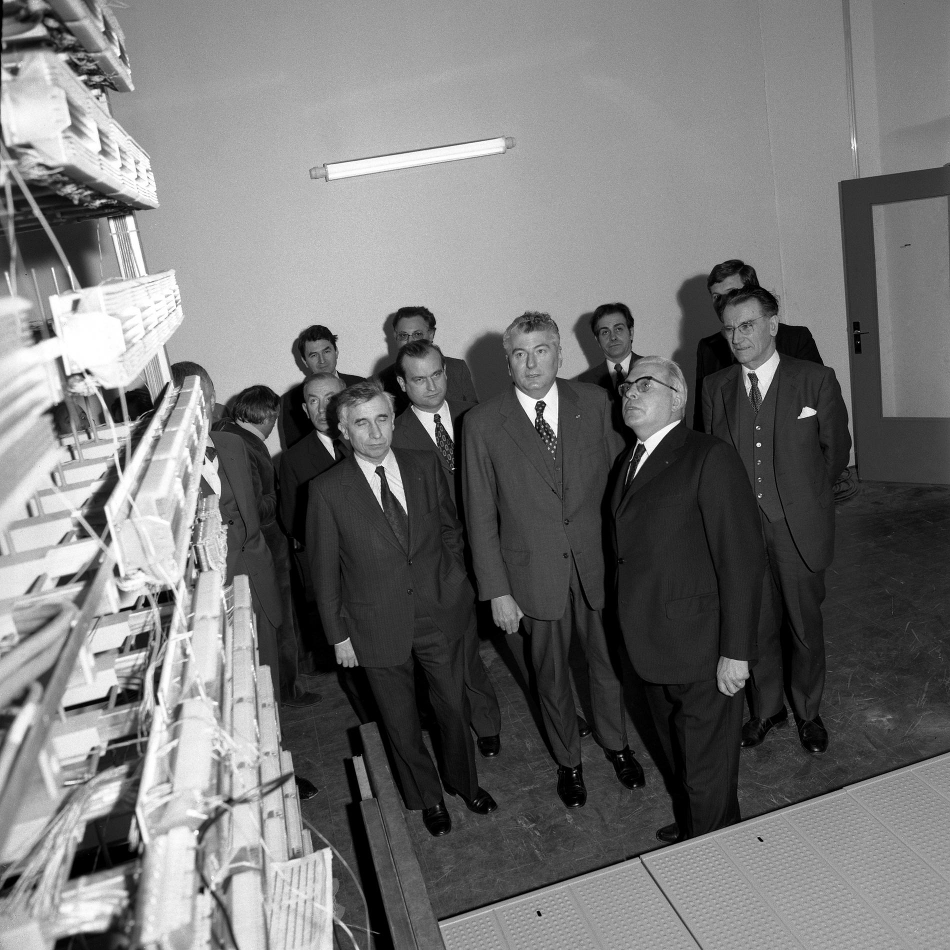 Ci-dessus : inauguration solennelle du Centre Téléphonique Tuileries par M. le Premier Ministre - Pierre Messmer, entouré de hautes personnalités.