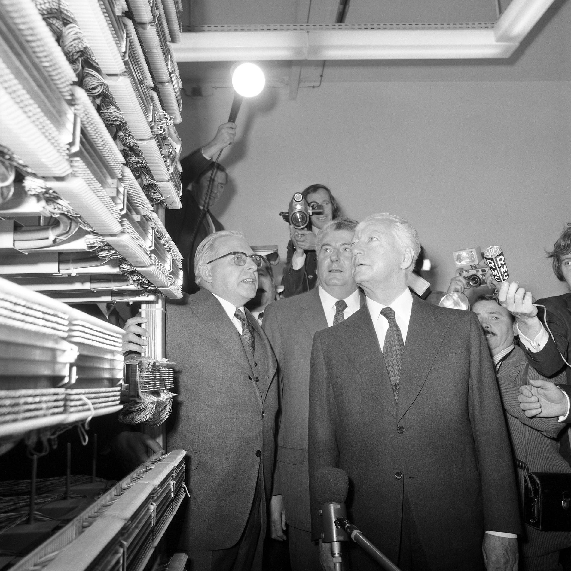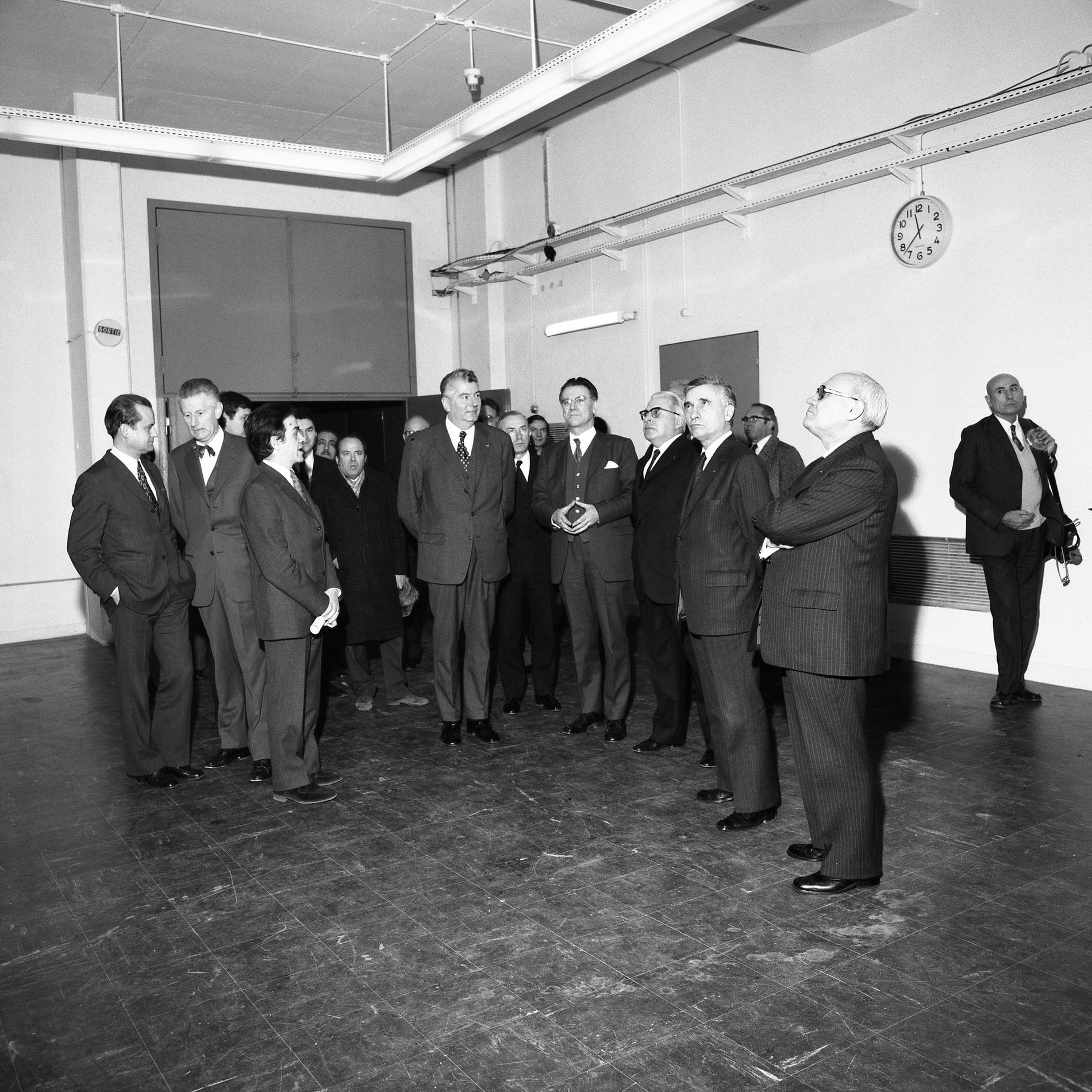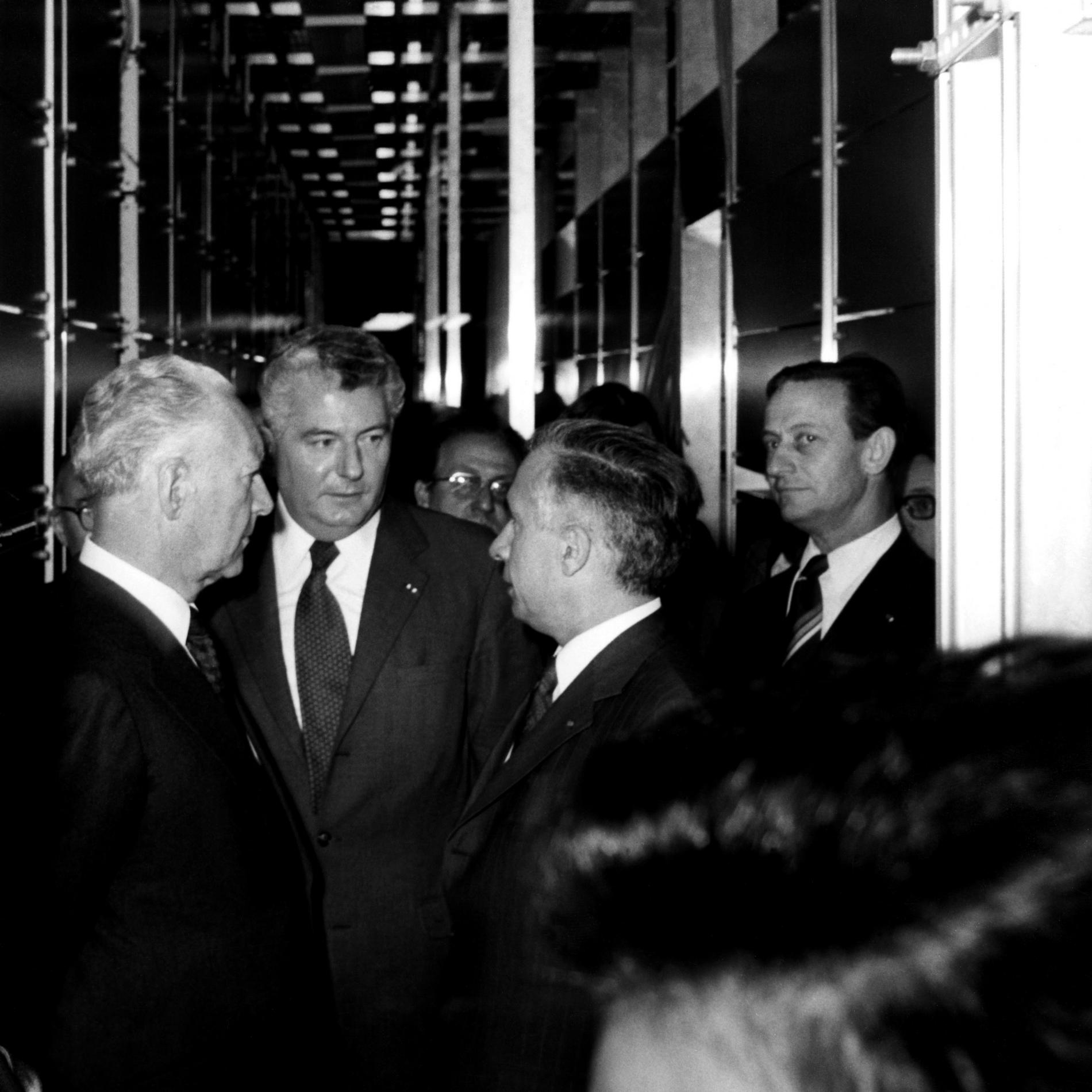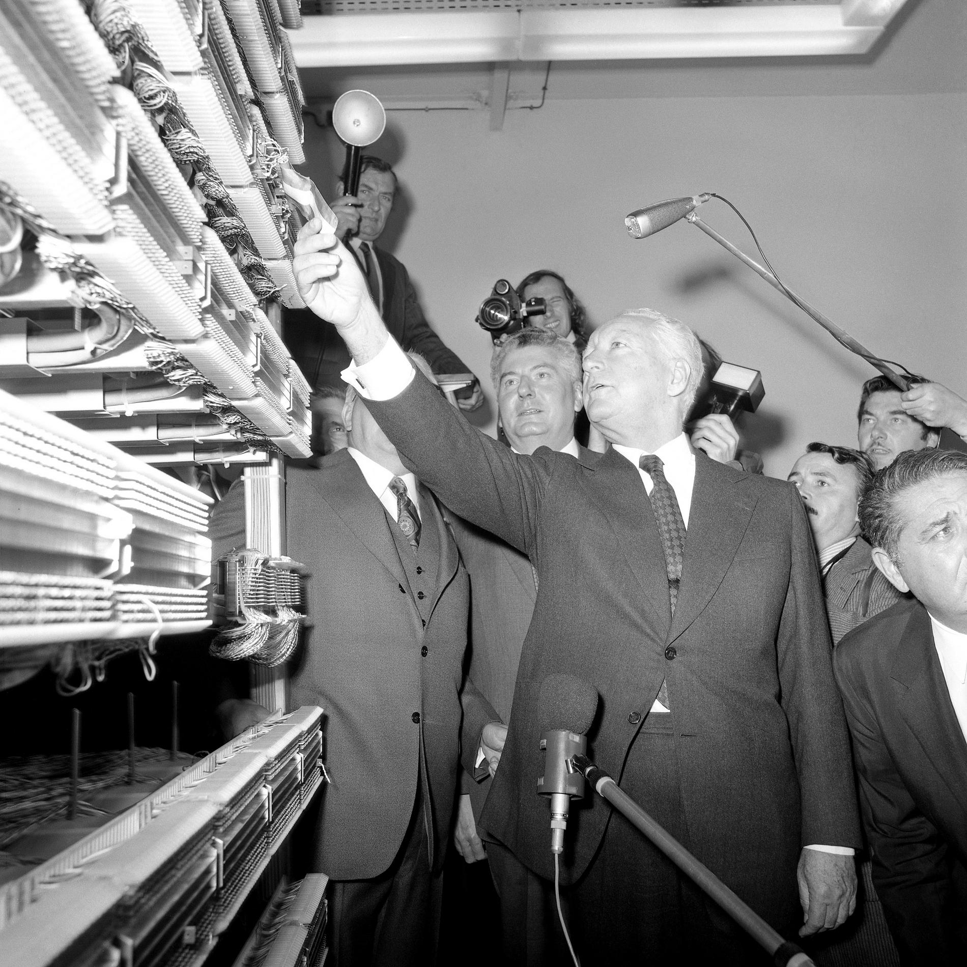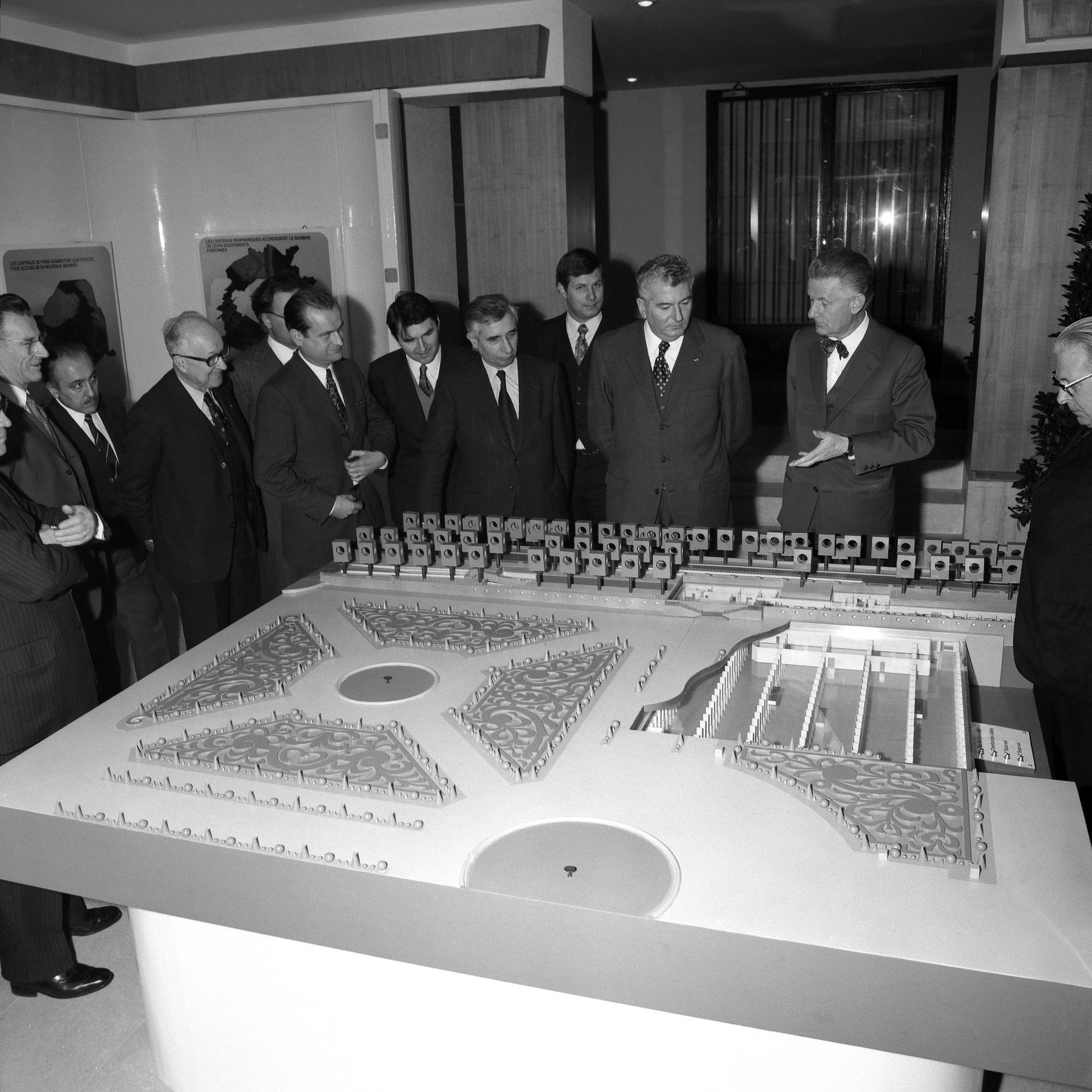 Ci-dessus : inauguration solennelle du Centre Téléphonique Tuileries par M. le Premier Ministre - Pierre Messmer, entouré de hautes personnalités.