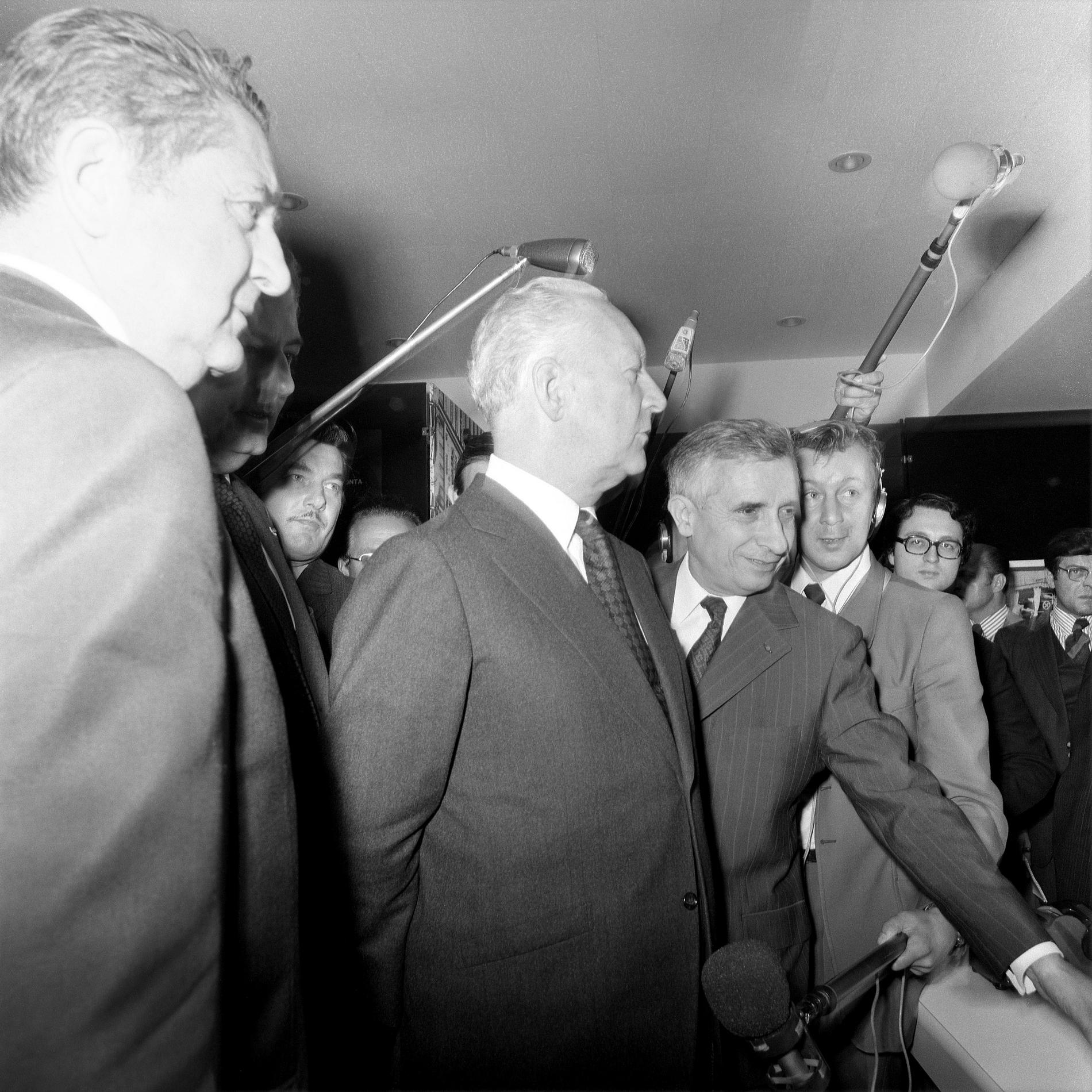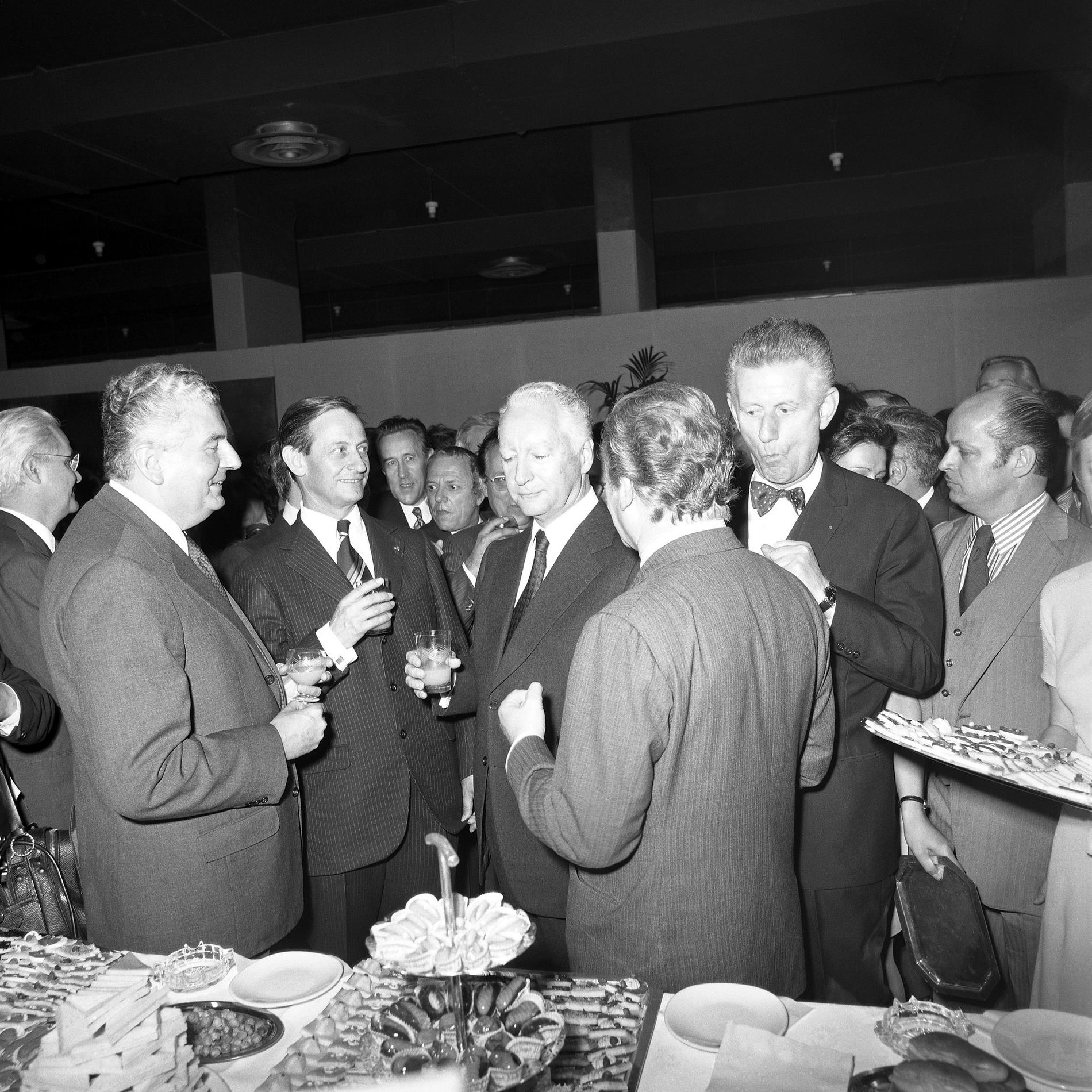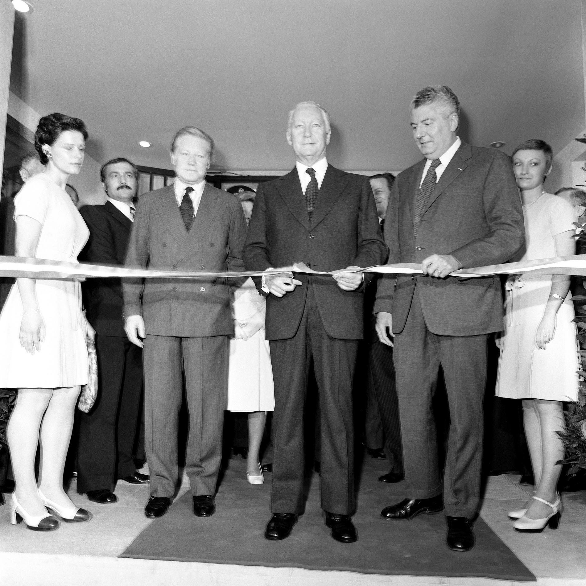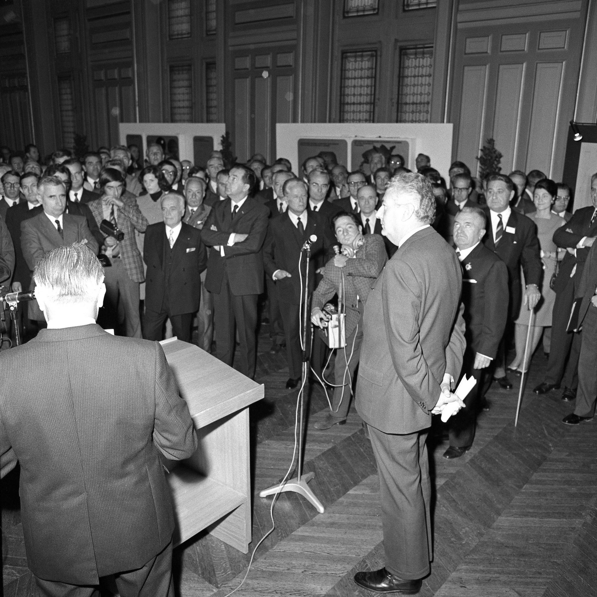 Ci-dessus : inauguration solennelle du Centre Téléphonique Tuileries par M. le Premier Ministre - Pierre Messmer, entouré de hautes personnalités.