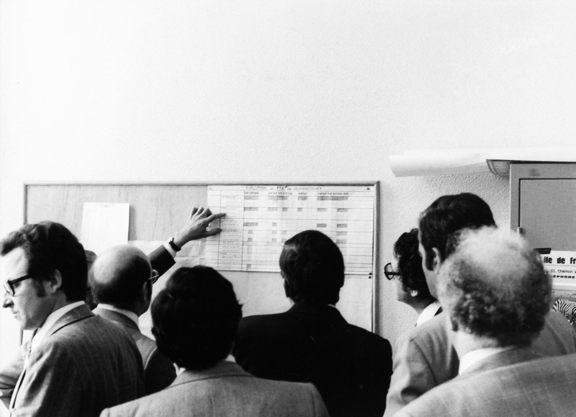 Ci-dessus : une réunion de l'état-major s'est tenue, lors d'une visite du Centre Principal d'Exploitation de Trappes, dans les locaux du Centre Téléphonique nouvellement créé de Guyancourt.
