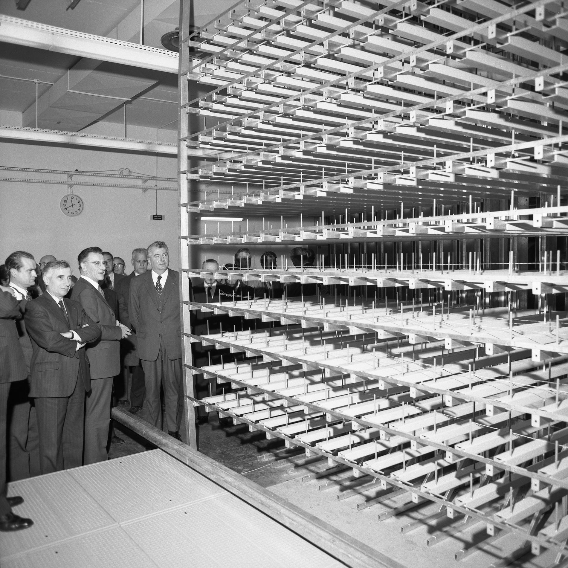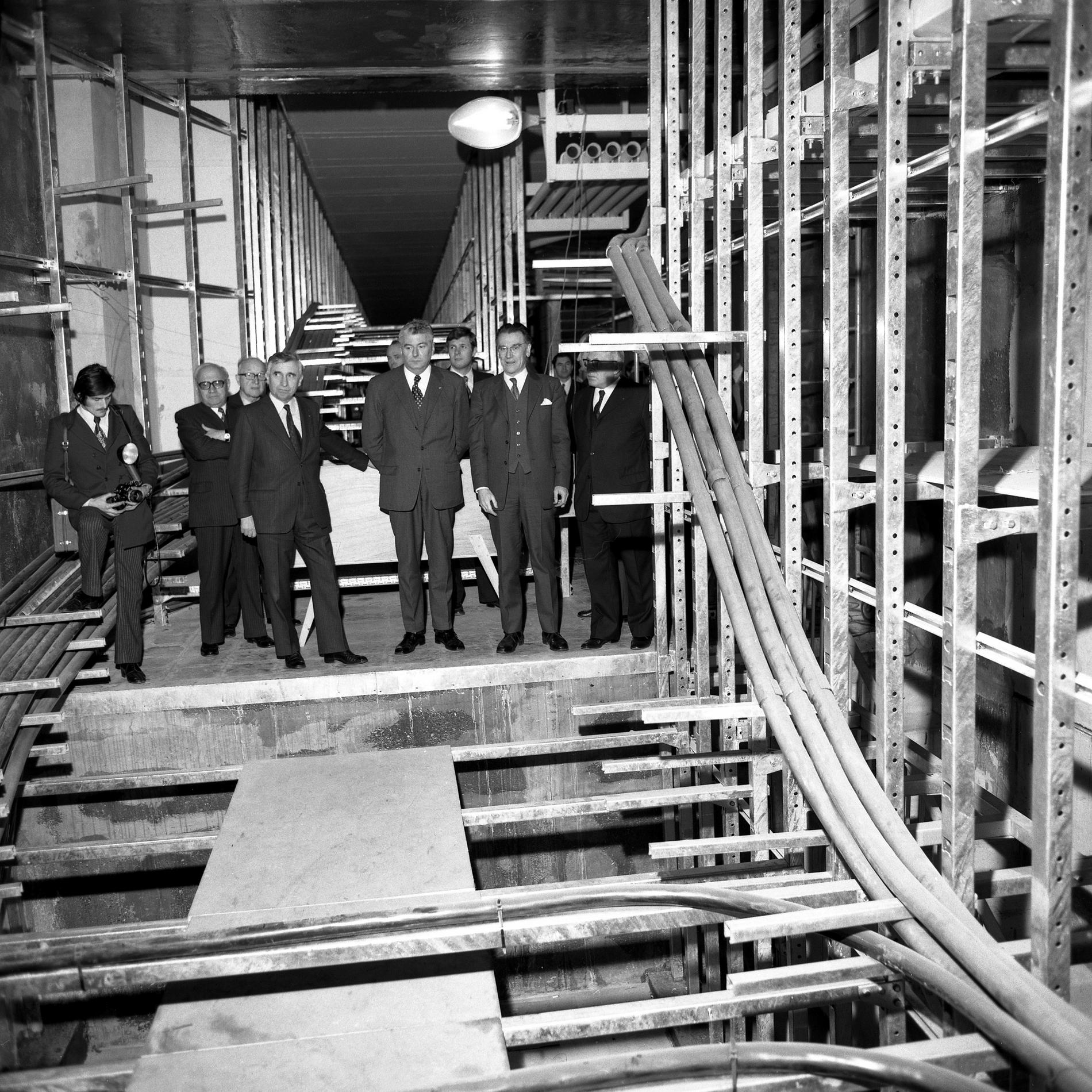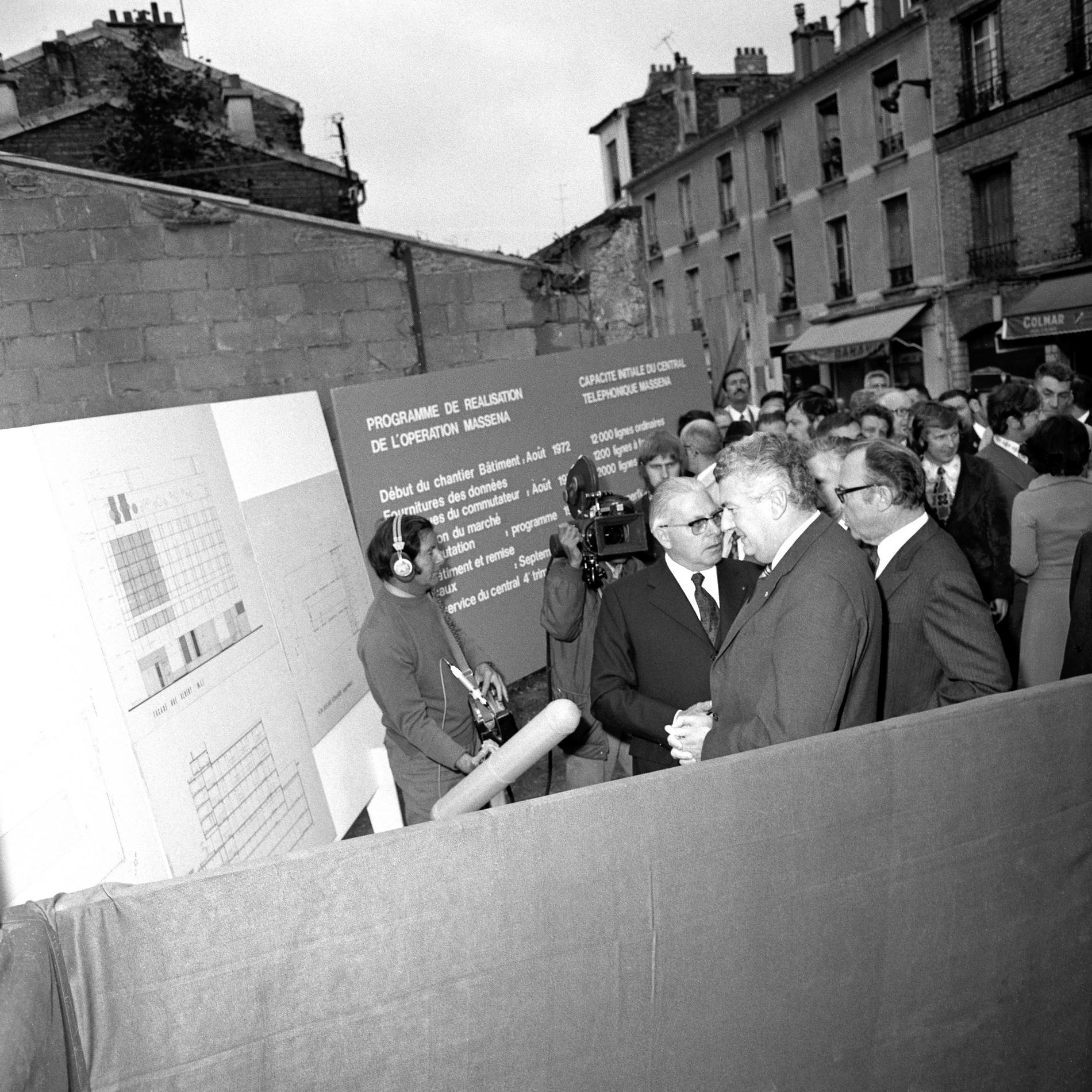 Ci-dessus : M. le Secrétaire d’État autonome aux Postes et Télécommunications - Pierre Lelong visitant le chantier du Centre Téléphonique International de Paris Bagnolet en construction (au premier plan près du microphone).