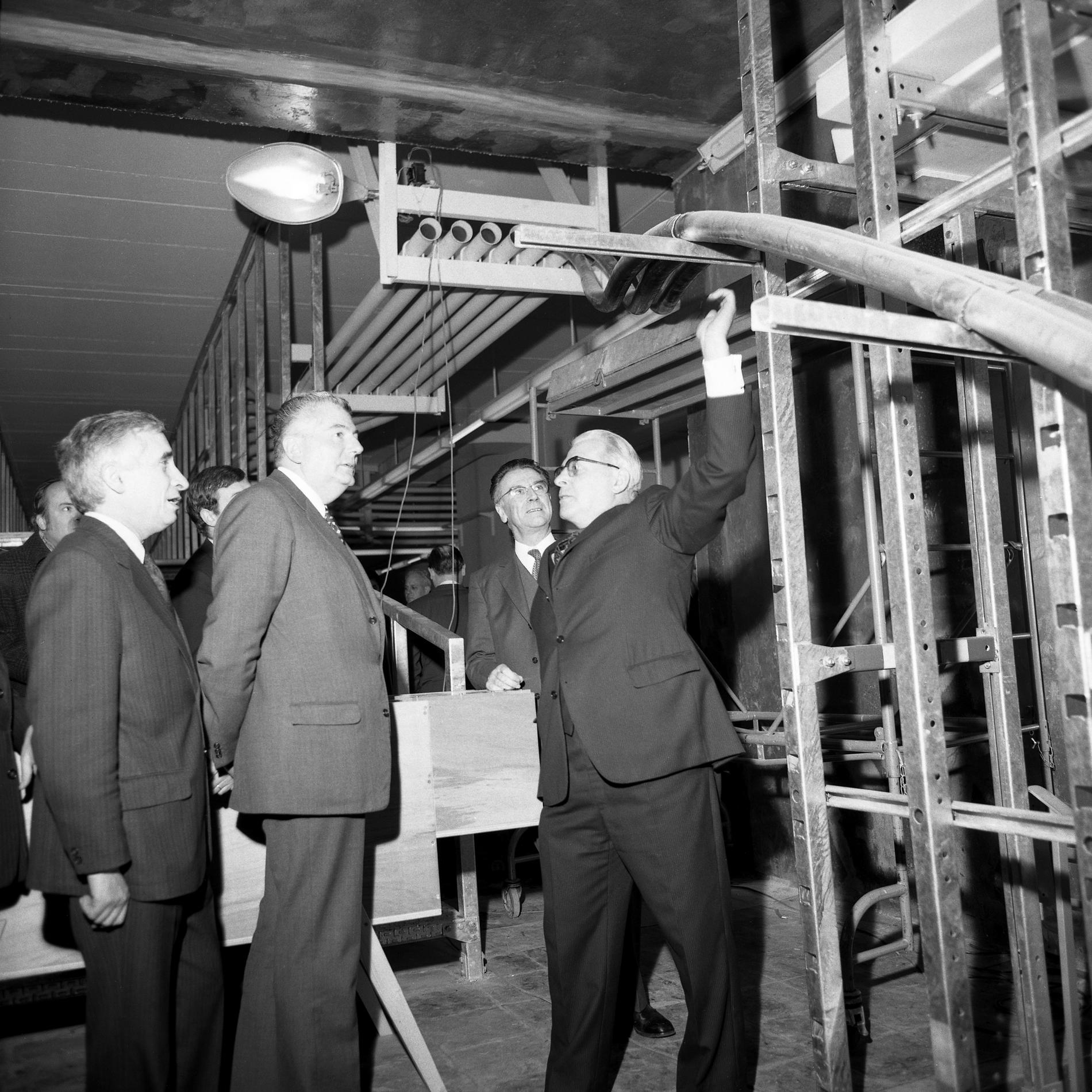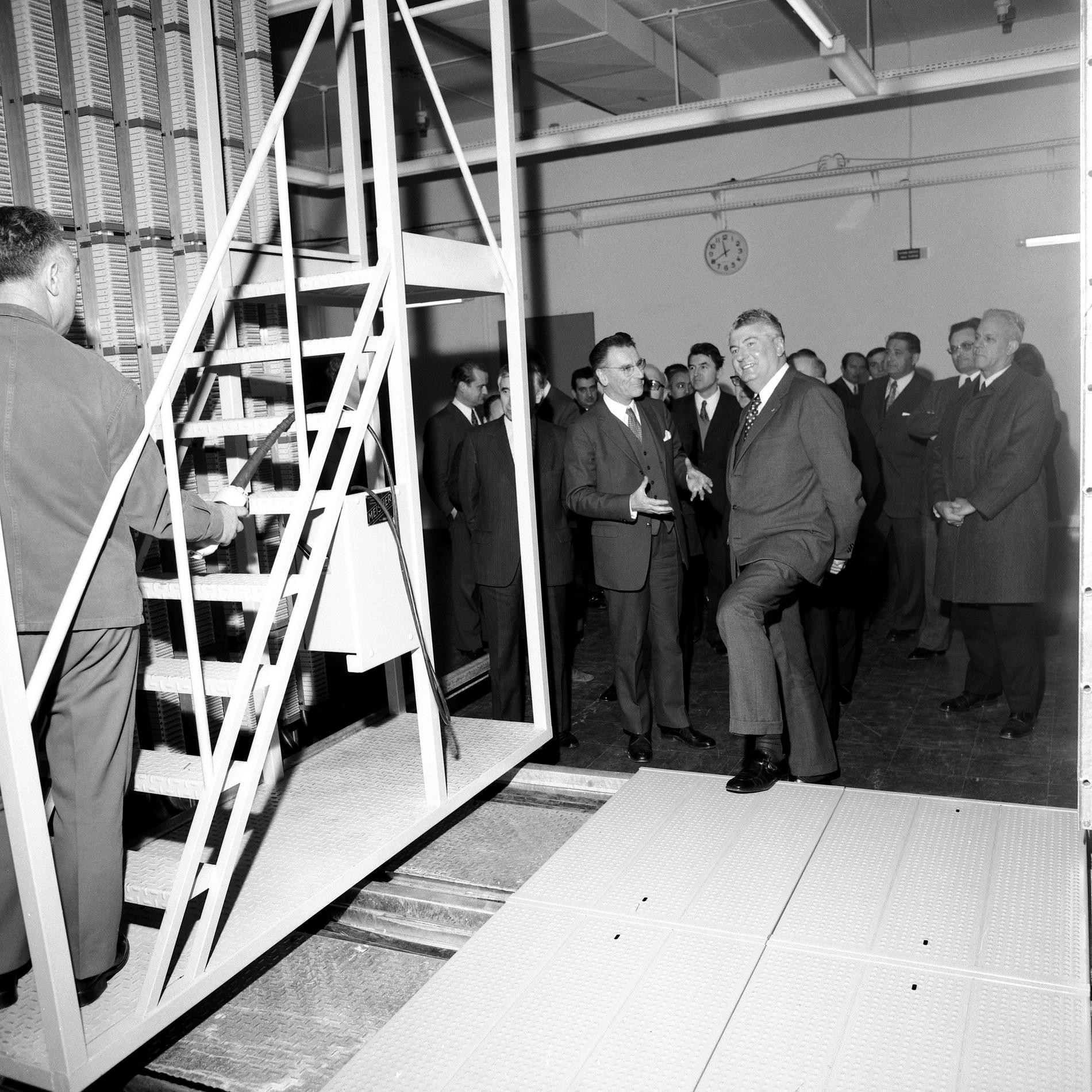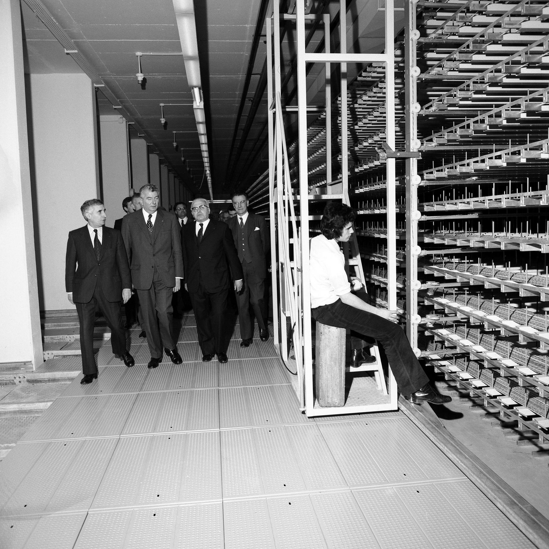 Ci-dessus : M. le Secrétaire d’État autonome aux Postes et Télécommunications - Pierre Lelong visitant le chantier du Centre Téléphonique International de Paris Bagnolet en construction (au premier plan près du microphone).