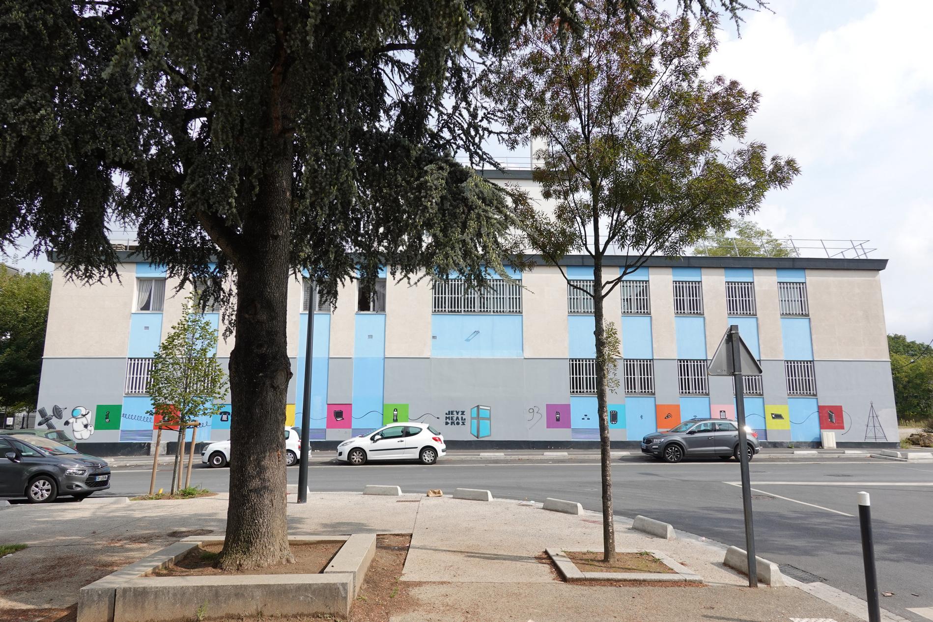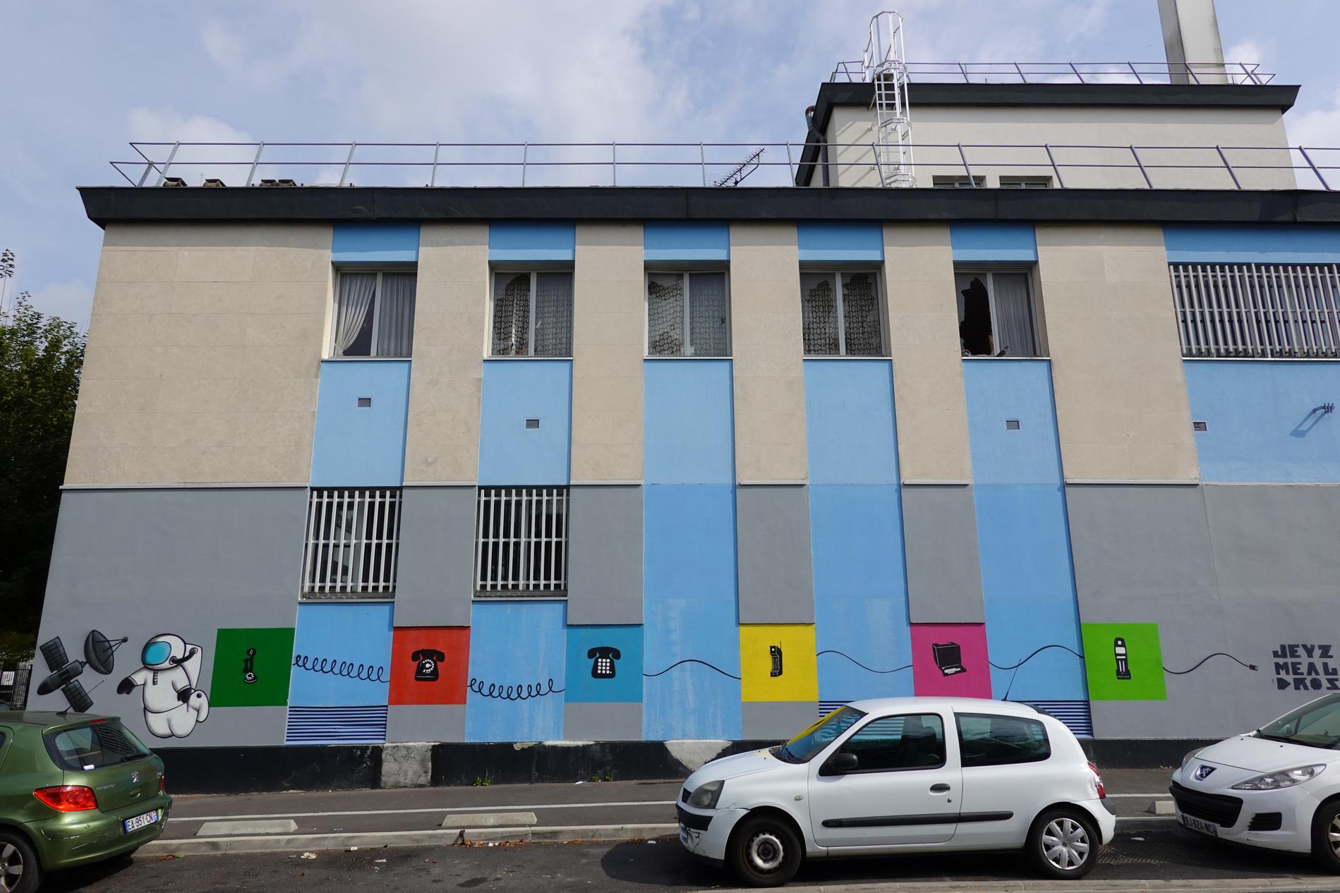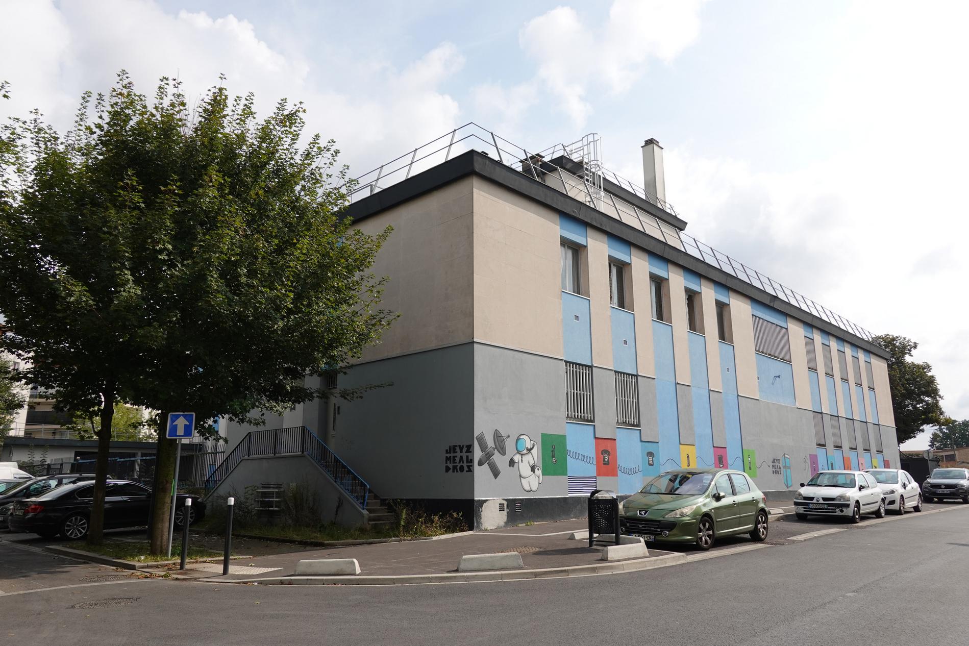 Ci-dessus : Centre Téléphonique de Montfermeil (93), dont la façade principale a été décorée par les collégiens/lycéens de cette ville d'un ensemble de fresques chronologiques récapitulant fidèlement l'histoire des Télécommunications, du Manuel à l'Automatique, du RTC à l'ADSL, en passant par la Publiphonie, la Télématique, le Radiotéléphone, etc...