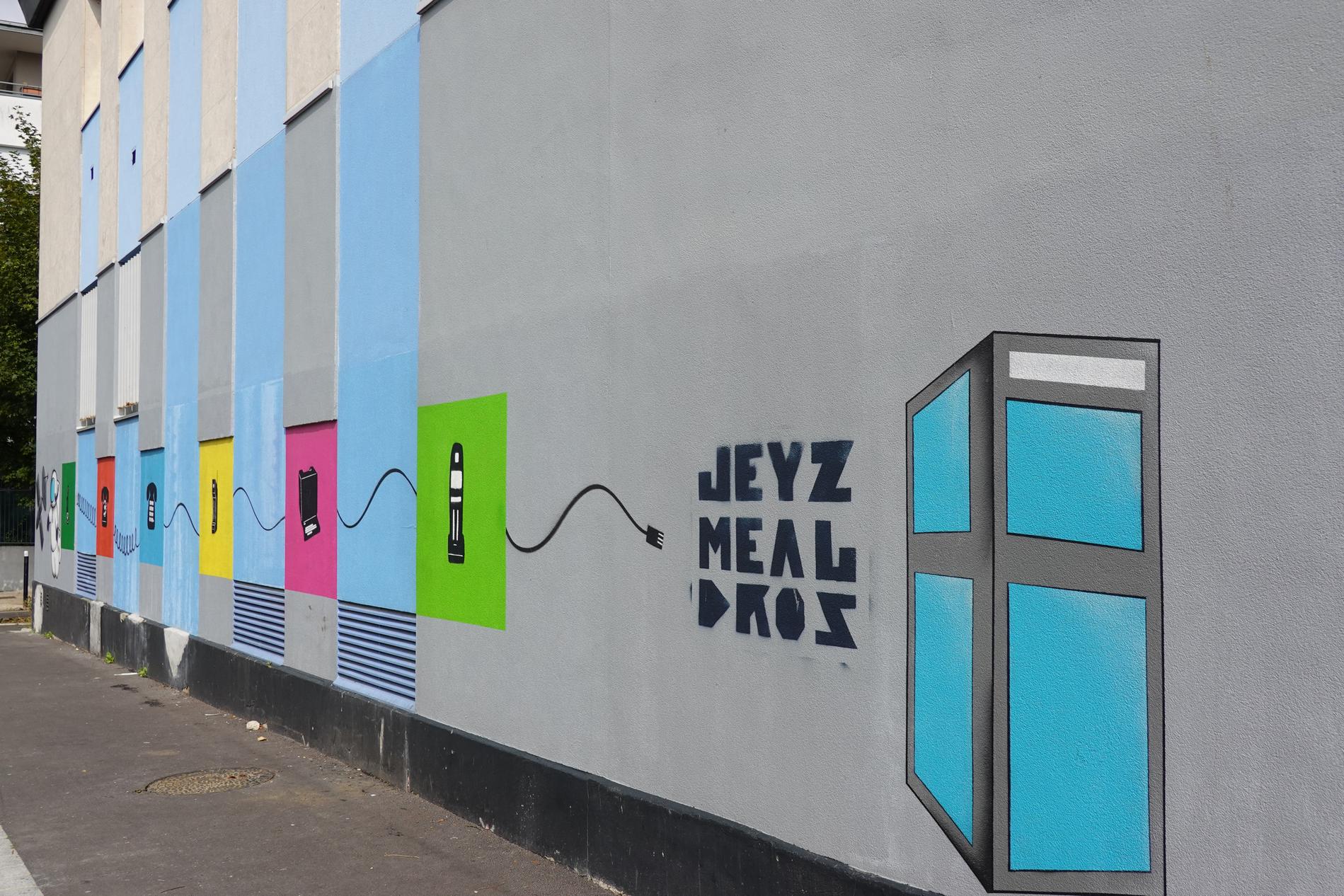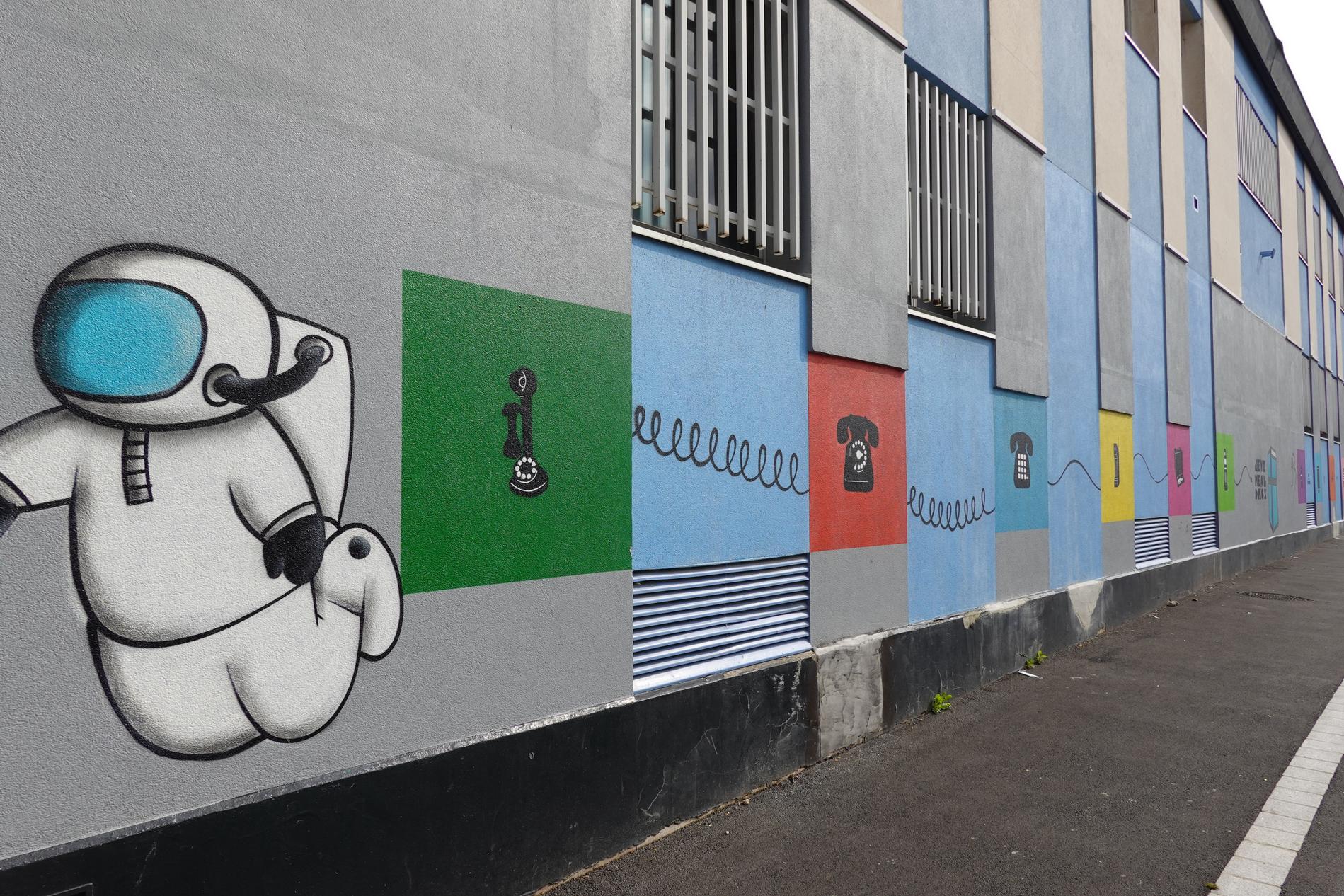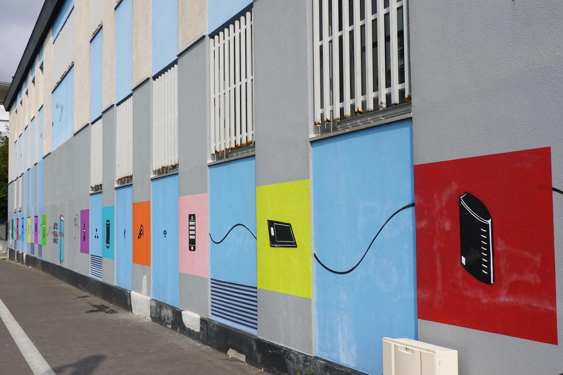 Ci-dessus : Centre Téléphonique de Montfermeil (93), dont la façade principale a été décorée par les collégiens/lycéens de cette ville d'un ensemble de fresques chronologiques récapitulant fidèlement l'histoire des Télécommunications, du Manuel à l'Automatique, du RTC à l'ADSL, en passant par la Publiphonie, la Télématique, le Radiotéléphone, etc...