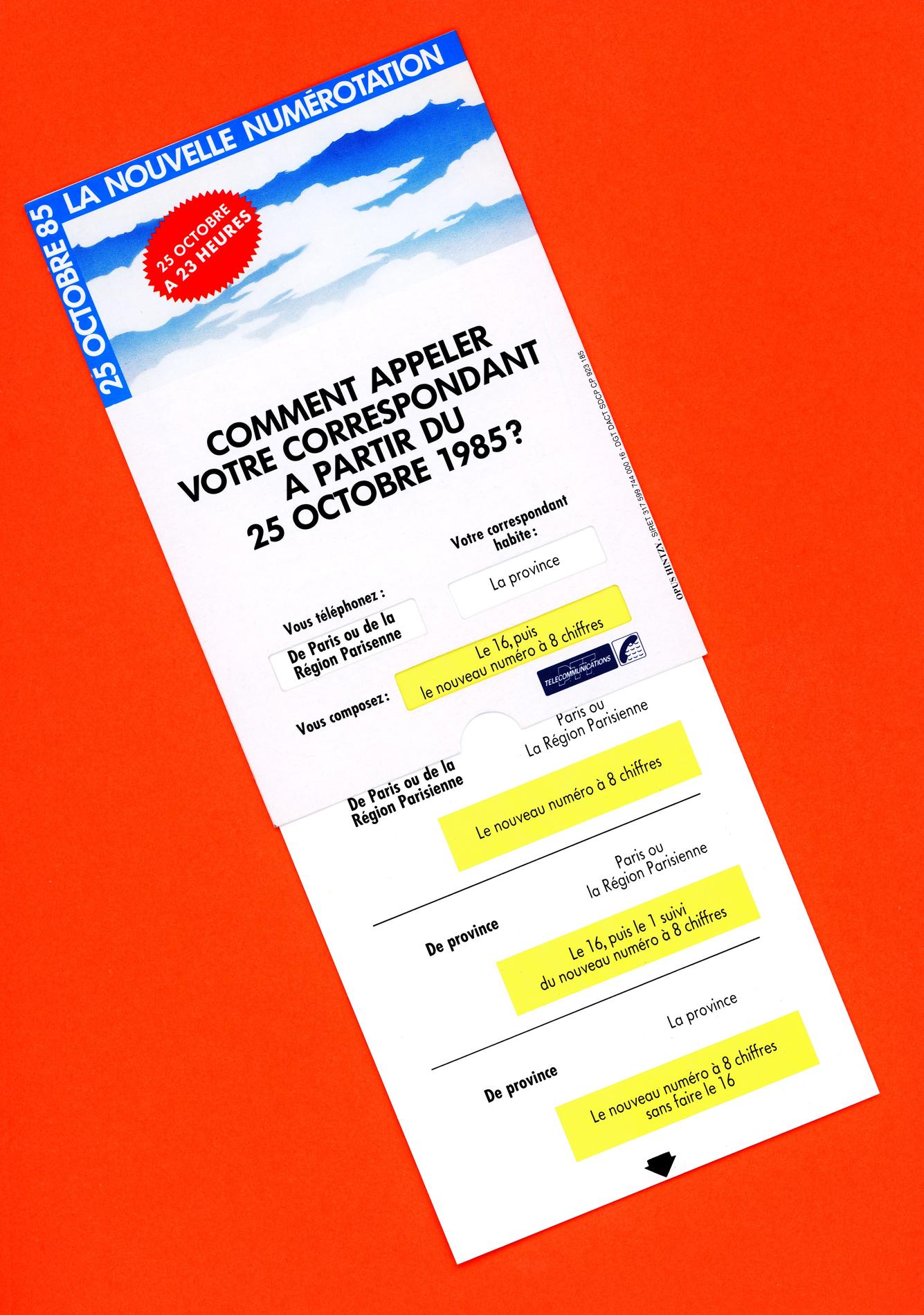 Le 25 octobre 1985 à 23H00, tout se simplifie. Ce moment marque le passage à la numérotation à 8 chiffres dans l’hexagone. (autocollant PTT)