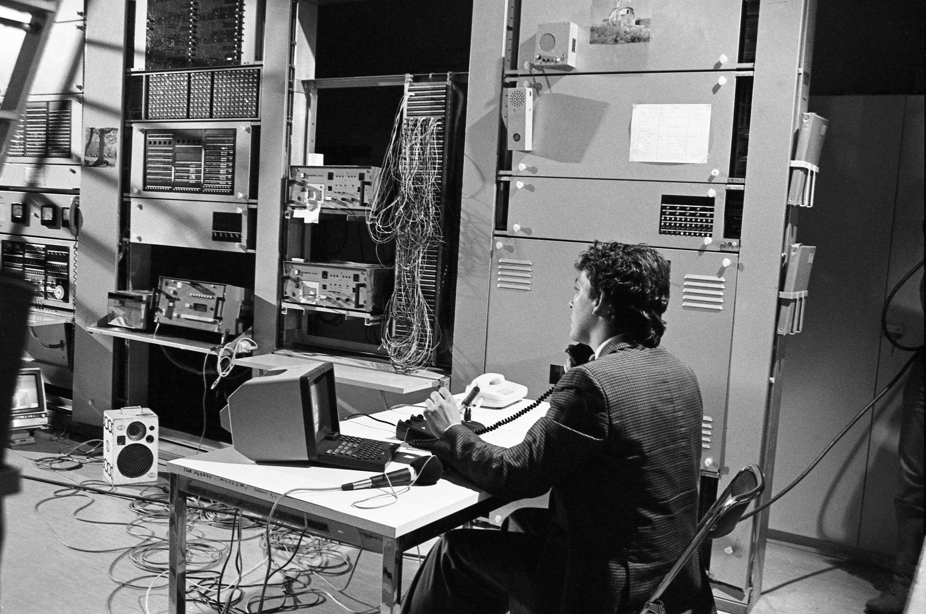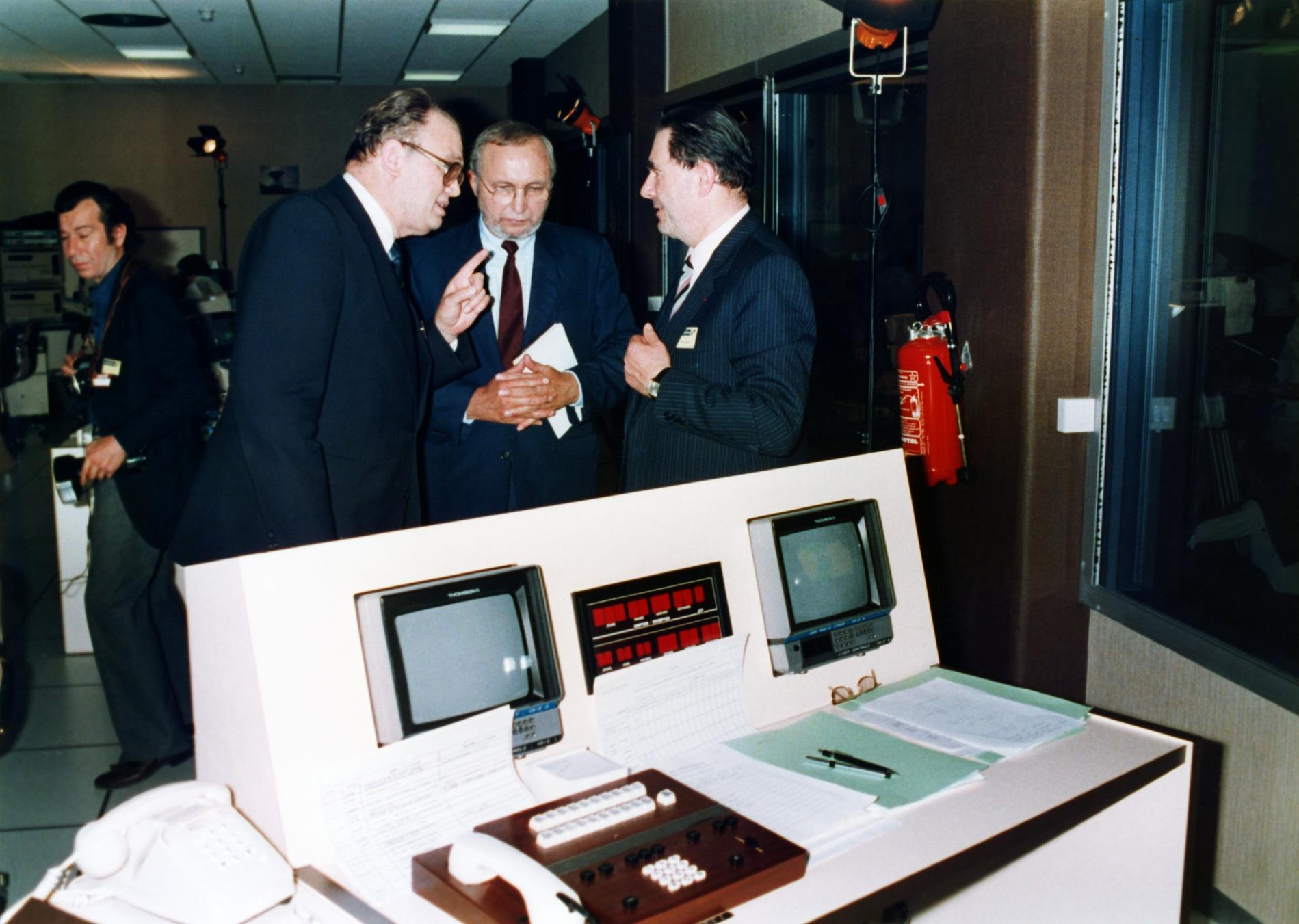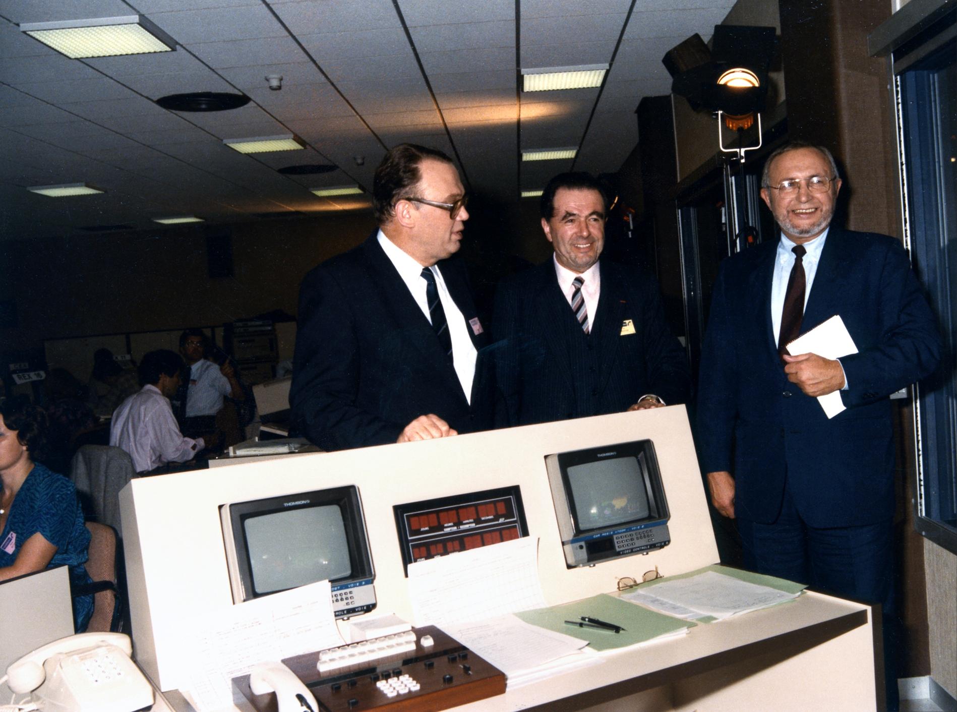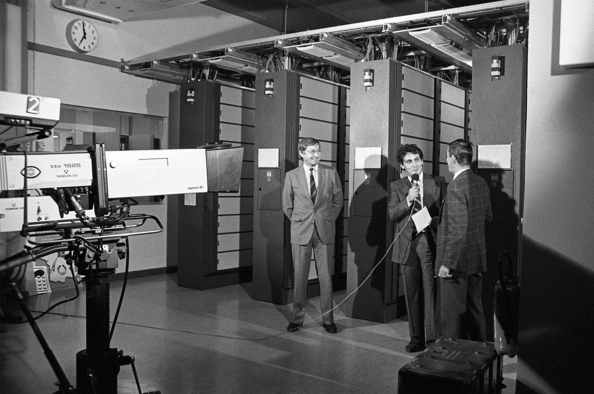Ci-dessus : Plateau TV-Direct au Centre National de Coordination de Murat, pendant la soirée du passage à 8 chiffres, le 25 octobre 1985 juste à 23H05, dans l'attente des premières informations sur la réussite du basculage dans le pays.