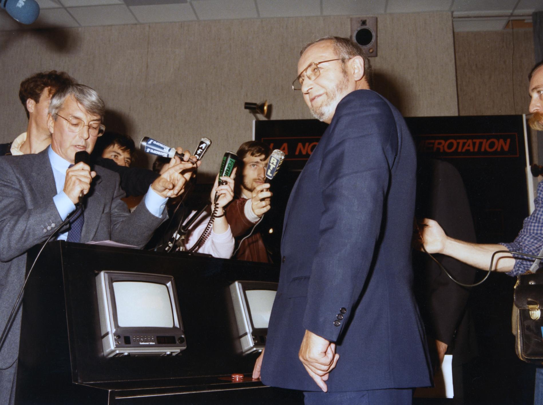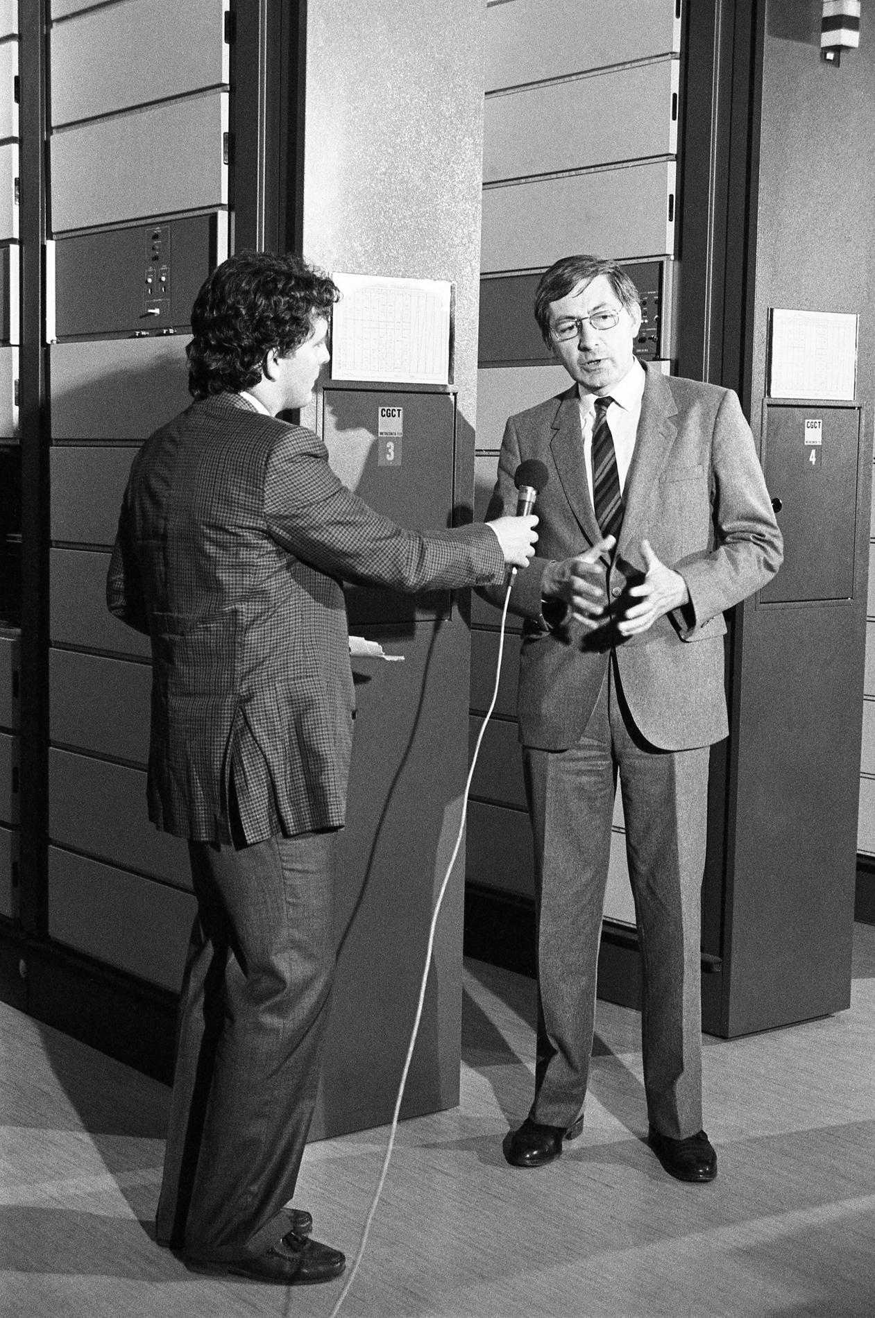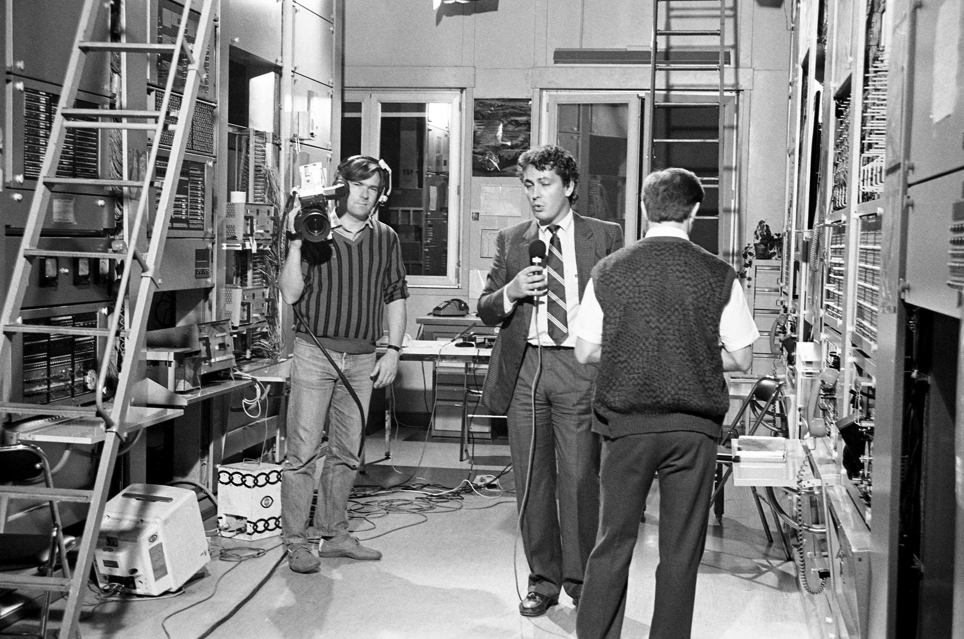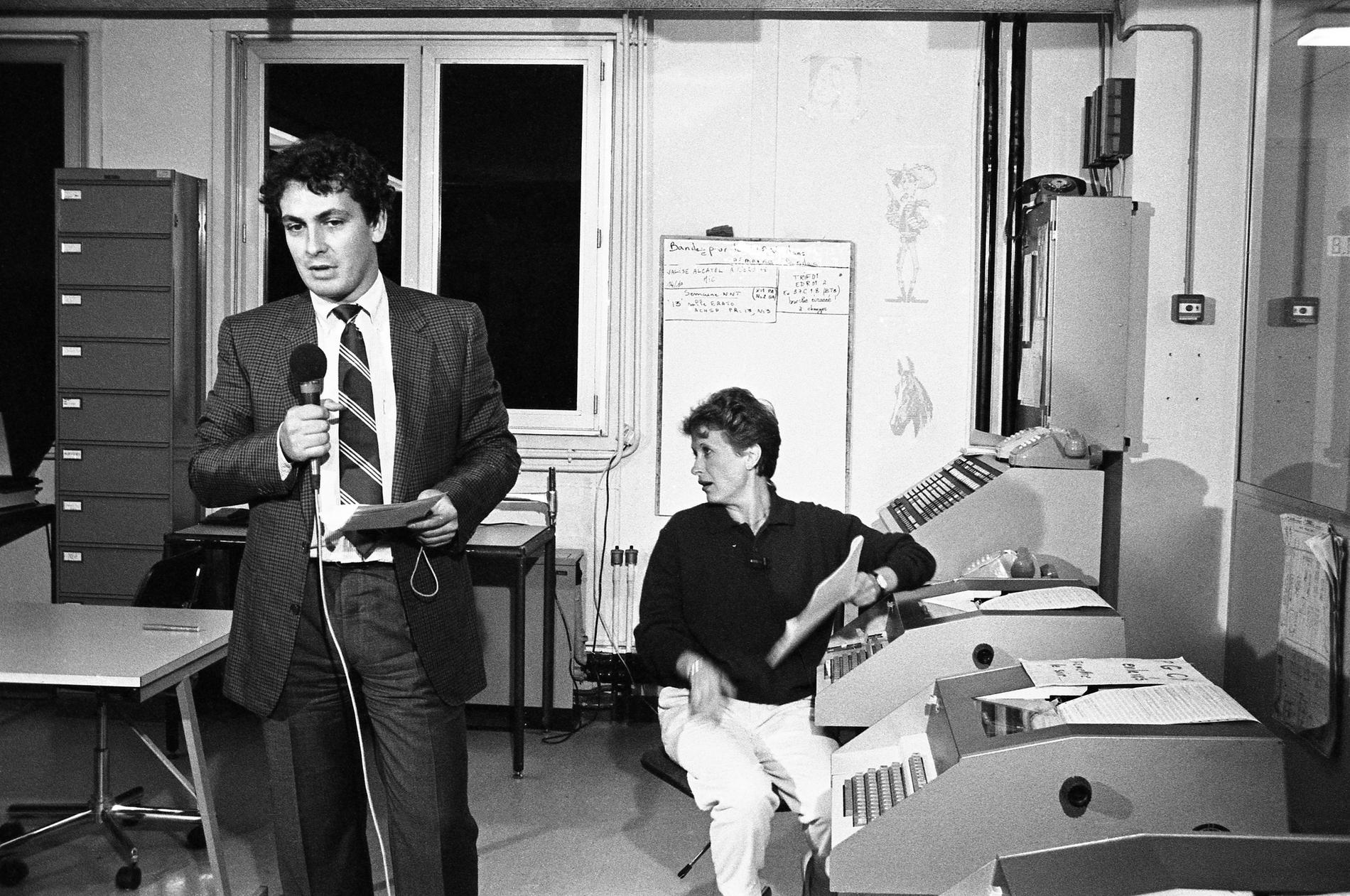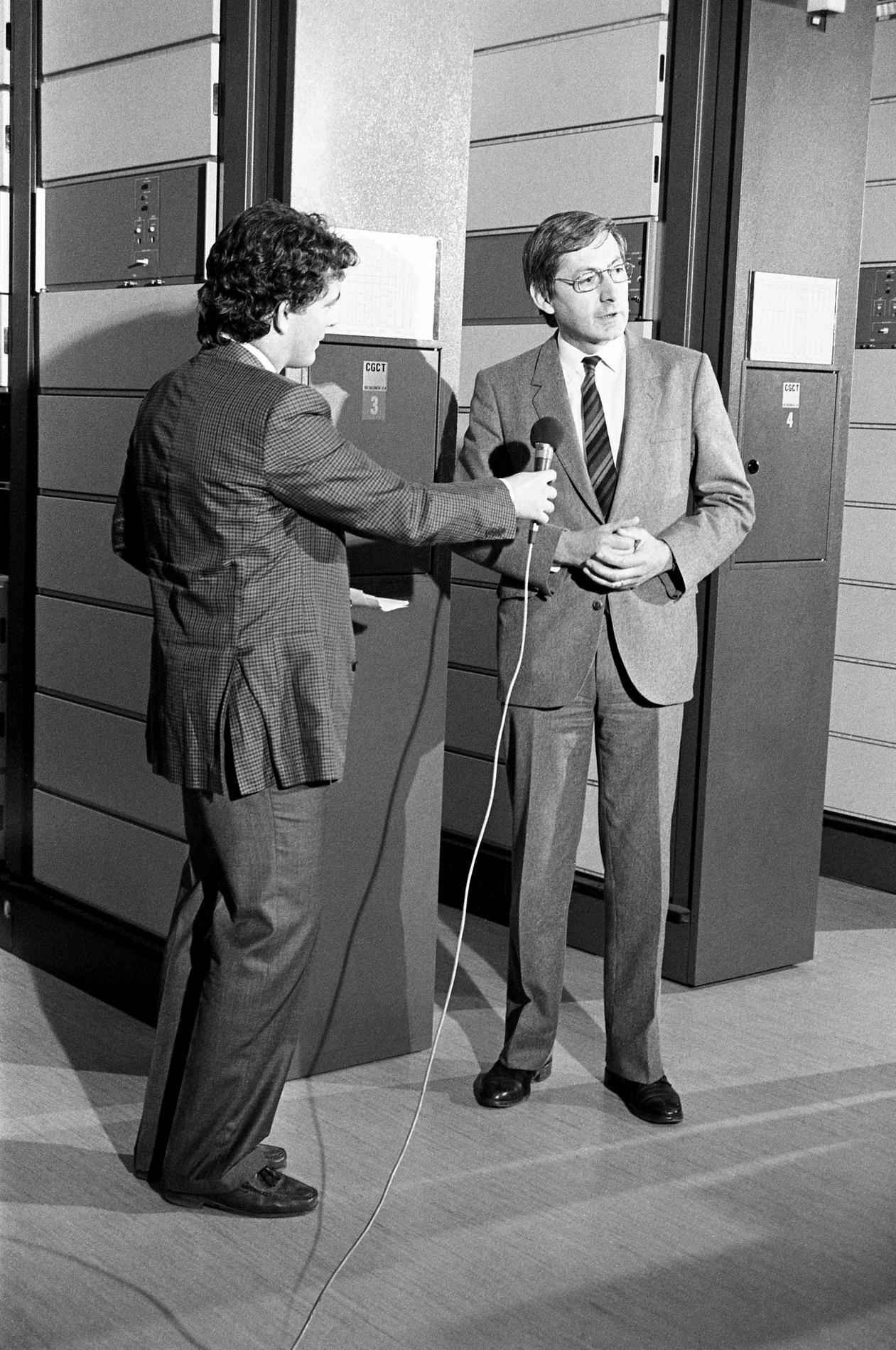 Ci-dessus : Plateau TV-Direct au Centre National de Coordination de Murat, pendant la soirée du passage à 8 chiffres, le 25 octobre 1985 juste à 23H05, dans l'attente des premières informations sur la réussite du basculage dans le pays.