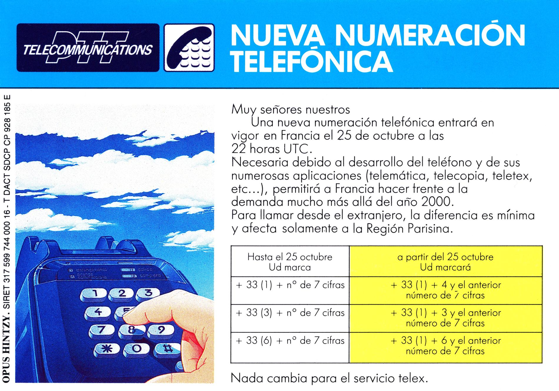 En 1982, la circulaire du 14 mai 1982 (B.O 1982. 192T41 page 295) annonce la mise en service du nouveau plan de numérotage le 1er juillet 1985. Cette date sera ultérieurement repoussée au 25 octobre 1985.
