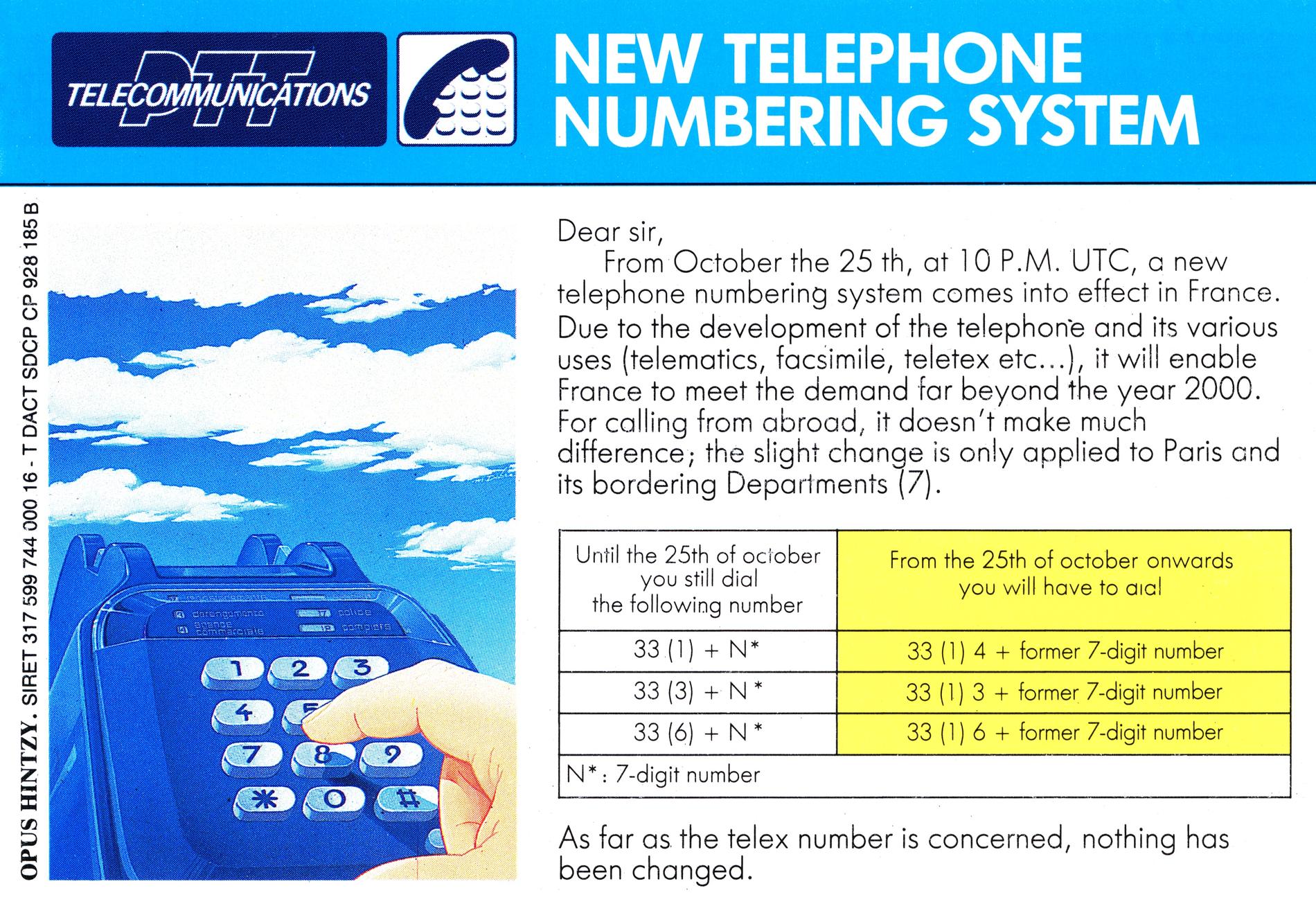 Ci-dessus : mot adressé au personnel par le Directeur Général des Télécommunications - Jacques Dondoux en Février 1985, afin que tous les fonctionnaires, de l'Agent de base jusques aux Directeurs, soient imprégnés de la nouvelle numérotation, pour un service au public irréprochable.